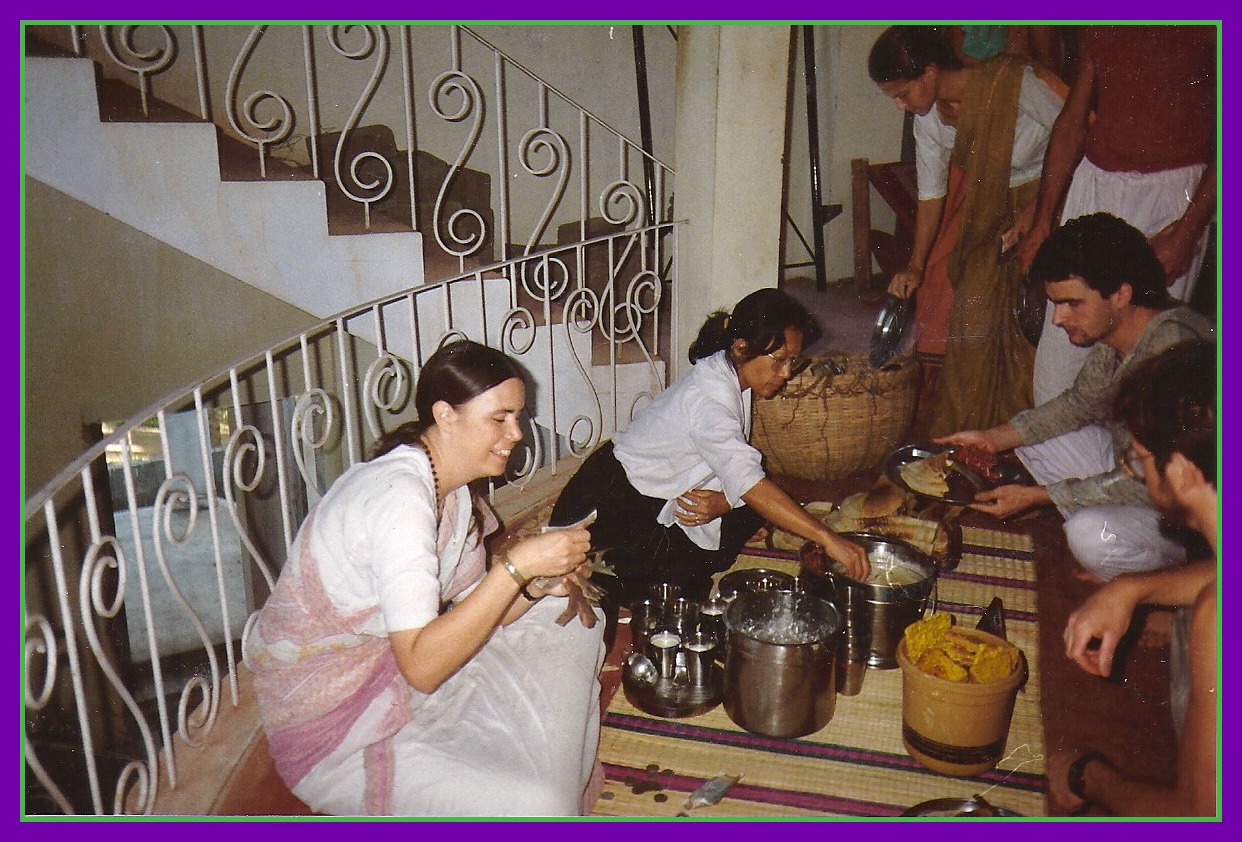 She was in India when I made my first trip to the Amritapuri ashram in January 1990. At that point, there were 30 Western visitors in the ashram (now there are usually around 1200!). That was also the month that a special canteen became available for westerners who preferred food which was less spicy than the Indian food. The new canteen was organized by Nirmalamrita. In the beginning it was set up on the temple balcony and served soup and one or two other items.