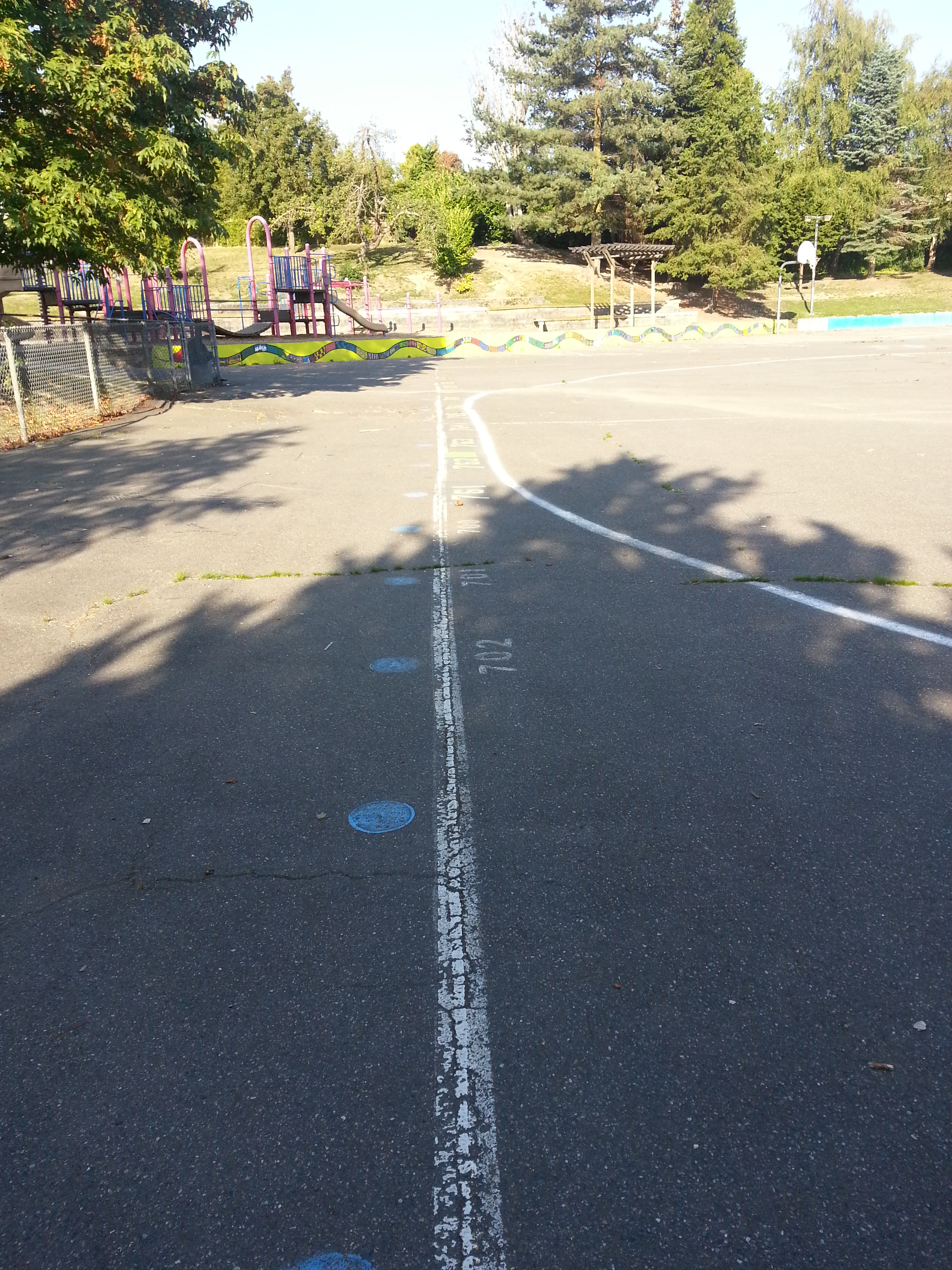 Most mornings I walk up to the school yard chanting/reading the Sri Lalita Sahasranama, my form of morning prayer. I do this over a 30 minute period while walking around the perimeter of the schoolyard. Since I am walking, reading and chanting all at the same time, I tend to follow the white line that goes around most of the yard. That way I am less likely to trip over something!