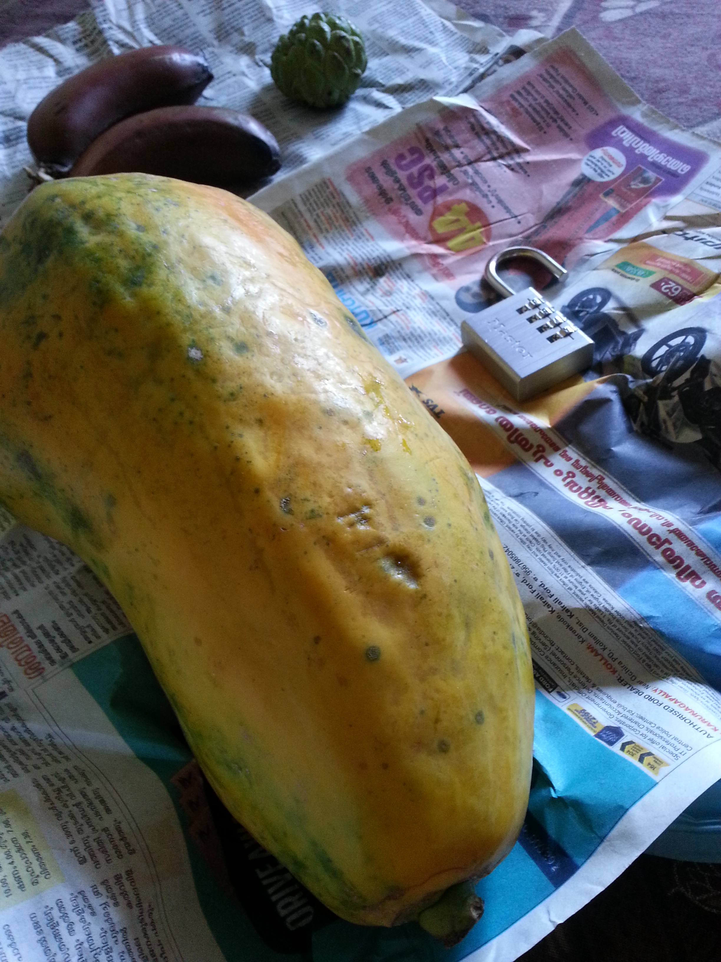 Speaking of the papaya, the fruit here is incredible. I remember the first time I saw a papaya in Mumbai. At the time I thought the papayas we have in the U.S. must look so sick to people who grew up here. I added the lock to the picture below so you would get a sense of the size of this papaya. (The main part of the lock is about two inches long.) It was so big I was very glad I could share it with Chai, Akshay and Sreejit!