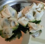 I was introduced to the green fruit below last year. It is called a custard apple or cherimoya. To me the fruit tastes like a cross between an apple and a very ripe pear. Inside each of the segments is a very large seed. I like the optical illusion of the seed picture. I can “see” it as if the seeds are in a small tin, or as if the tin is flipped over and the seeds are on the bottom. In actuality the seeds are inside the tin.