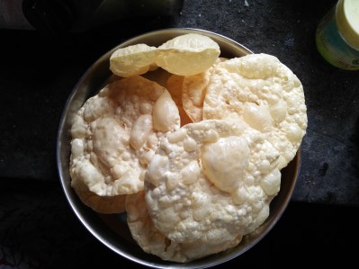 At one point during the Tuesday prasad lunch (the day when Amma gives everyone lunch), I looked up and saw six crows perched in a line towards the top of the auditorium. The crows were intently watching the activity below. If one saw an opportune moment, it would swoop down and take a pappadam off of someone’s plate. I saw several crows with partial pappadams in their mouths so maybe they were stealing pappadams from each other as well. When I looked up five or ten minutes later, all of the crows were gone. Perhaps they were feasting on their plunder. (The photo of pappadams came from Wikimedia.)