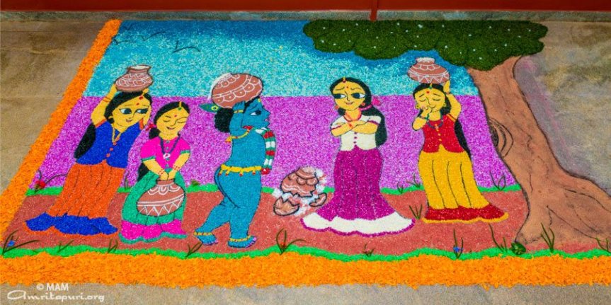 A few days ago, I heard someone say that Onam is like a combination of New Year’s Day and Thanksgiving. I liked that way of thinking about it. Daily pukkallams are still being created near Amma’s house in honor of Onam. During my last “Living and Learning” post, I shared photos of the first three. Here are photos of the four newer ones. (The artwork is all made from flower petals.)