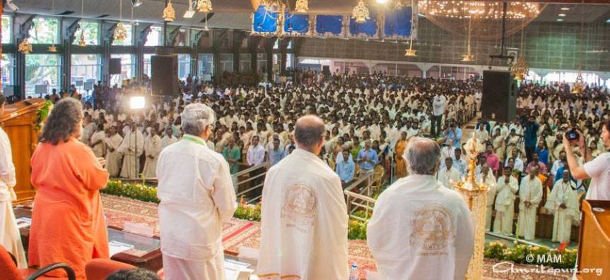 Amrita Vishwa Vidyapeetham, also known as Amrita University, has five campuses throughout India. The campus in Amritapuri has schools of Arts and Sciences, Ayurveda, Biotechnology, Business, Engineering and Social Work. On September 10, the 1440 students who completed their education in the 2016-2017 school year processed from the university, across the bridge that separates the ashram and the mainland where the university is located, through the ashram grounds, and ended in the ashram auditorium where the graduation ceremony would take place.