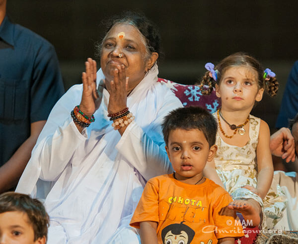 After the play we listened to Amma’s Christmas message. I will share the content of that speech if it is posted online later. After the Christmas message was finished, Amma sang Only Love is our Guiding Light and Jai Mata Di Jaykar Bulavo and then blessed the Christmas cake. Soon everyone had a sweet to end the night.