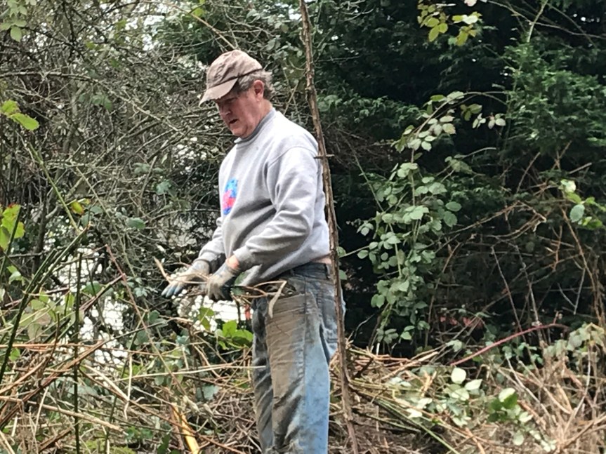 My neighbor John, who has diligently worked on this project from the beginning, cleared an area of blackberry canes and rootballs.