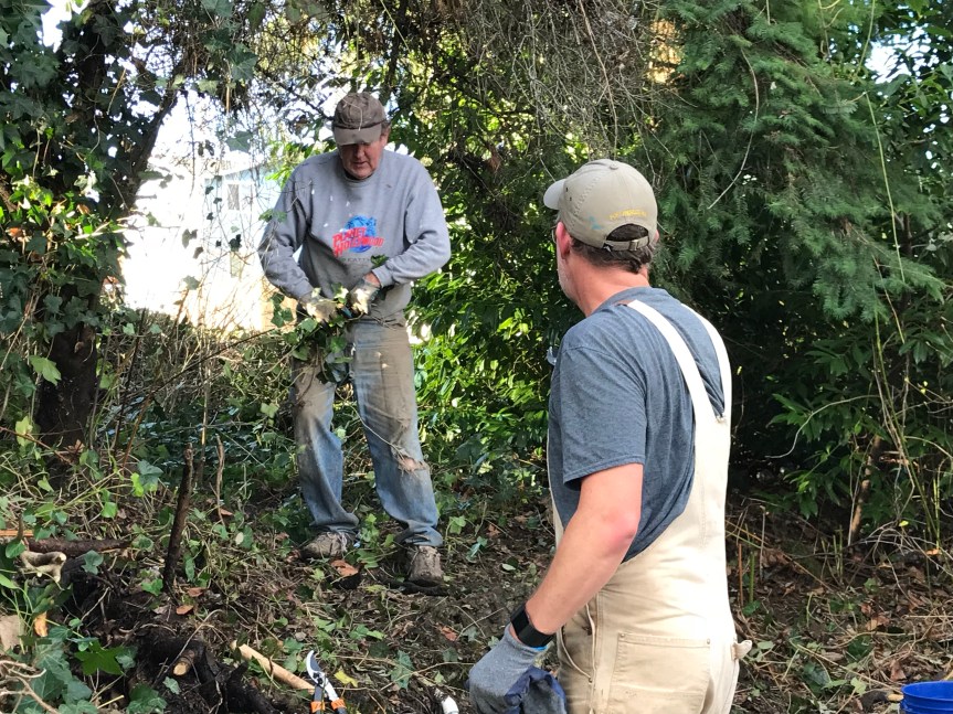 The group was enthusiastic and accomplished so much. One team worked to remove ivy and blackberry rootballs from a section of the property we haven’t tackled before.