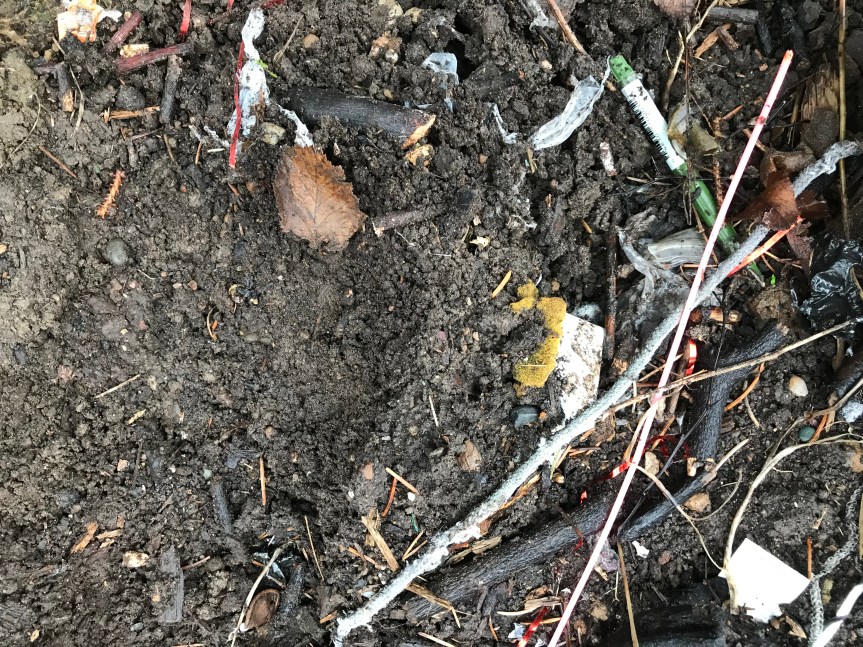 When the Seattle Parks Department staff initially cut down the blackberry vines for us, they discovered the foundation of a house that had burned down in the 1950’s. We found many plastic items in or near that foundation. It appears that a lot of plastic trash was also thrown into the Greenbelt by nearby residents and passersby.