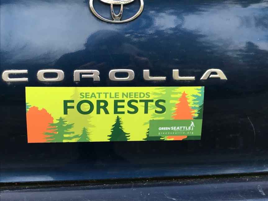 In my 49 years of owning cars, I have never put a bumper sticker on my car. Earlier this year, I was at a Green Seattle Partnership event where there were many displays. On one table there was a stack of bumper stickers. I picked up one even though I didn’t expect to use it, at least not as a bumper sticker.