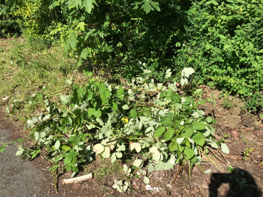 I couldn’t figure out how to reach the blackberry roots so that I could dig out the root balls. The best I could do was reach into the foliage and cut back the stalks.