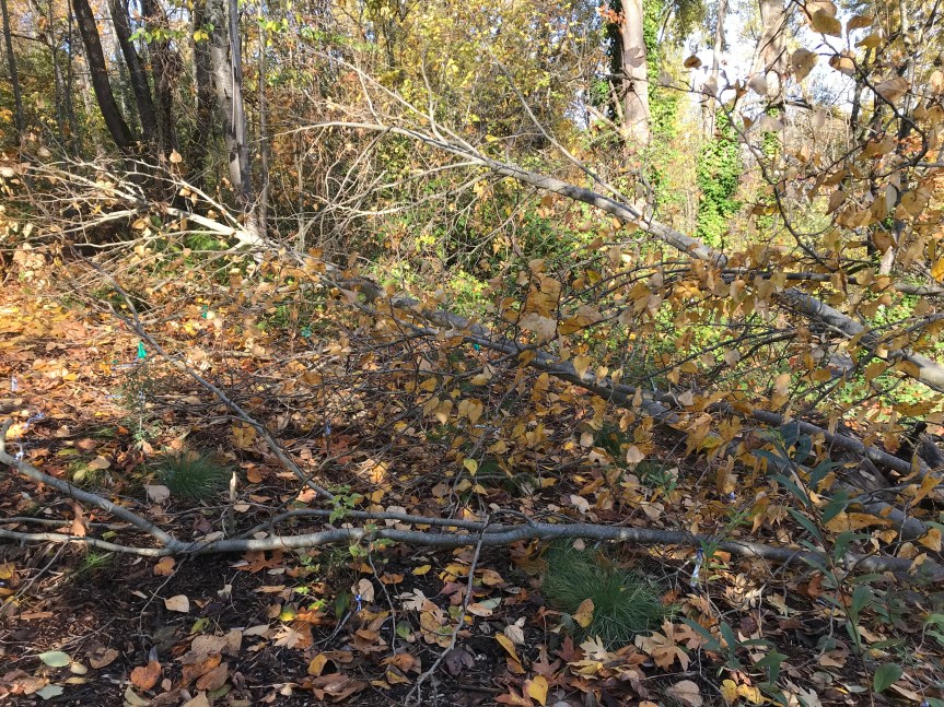 The next day, I walked into the Greenbelt, as I do most days. When I arrived at our eastern planting areas, I was horrified to see that the top of one of the trees was covering all of one planting area and part of another. I had never considered that as a possibility. There didn’t seem any chance that our plants could have survived such an event. I knew it was another letting go opportunity, but this one wasn’t going to be easy, I was way too attached.