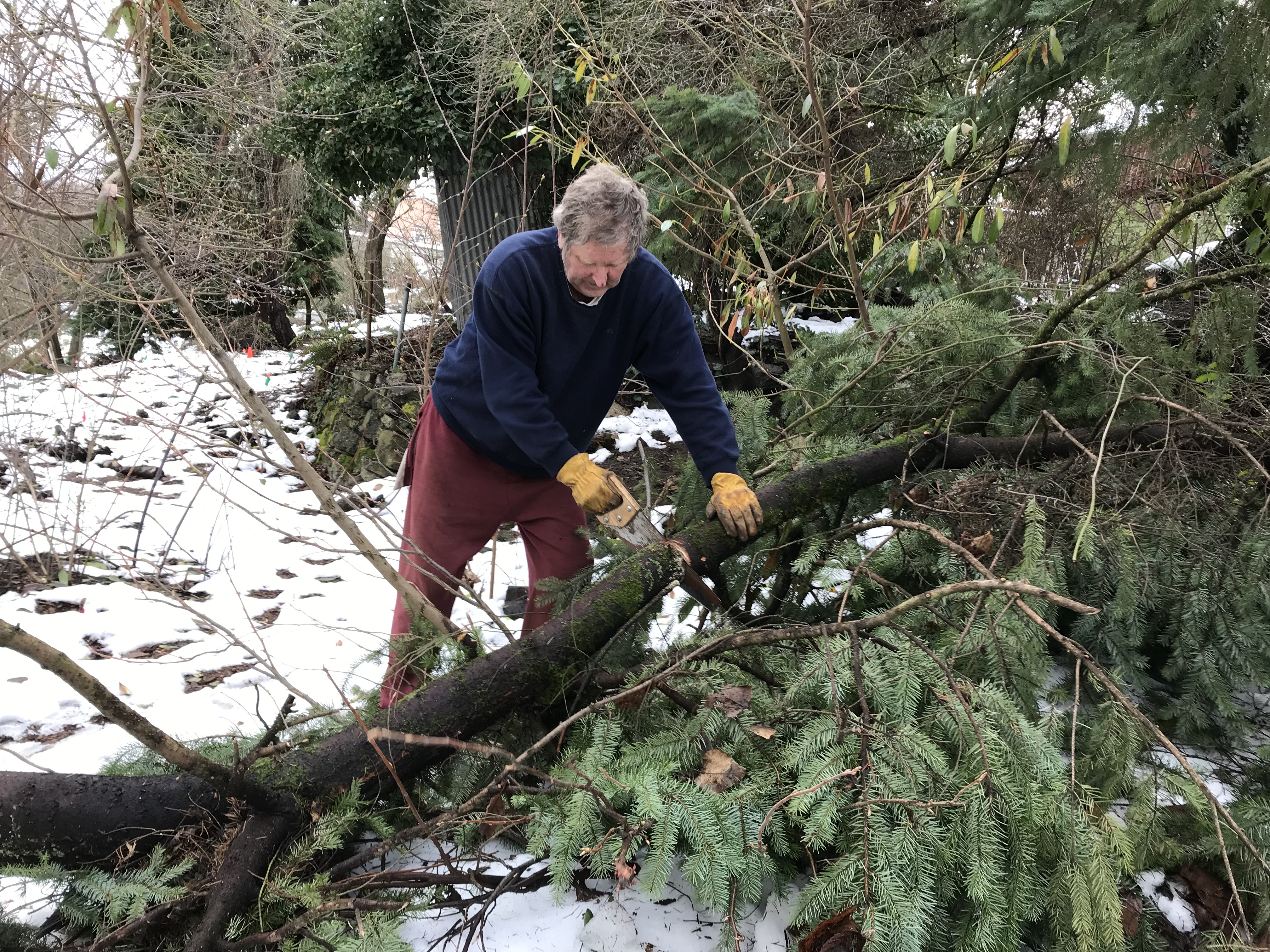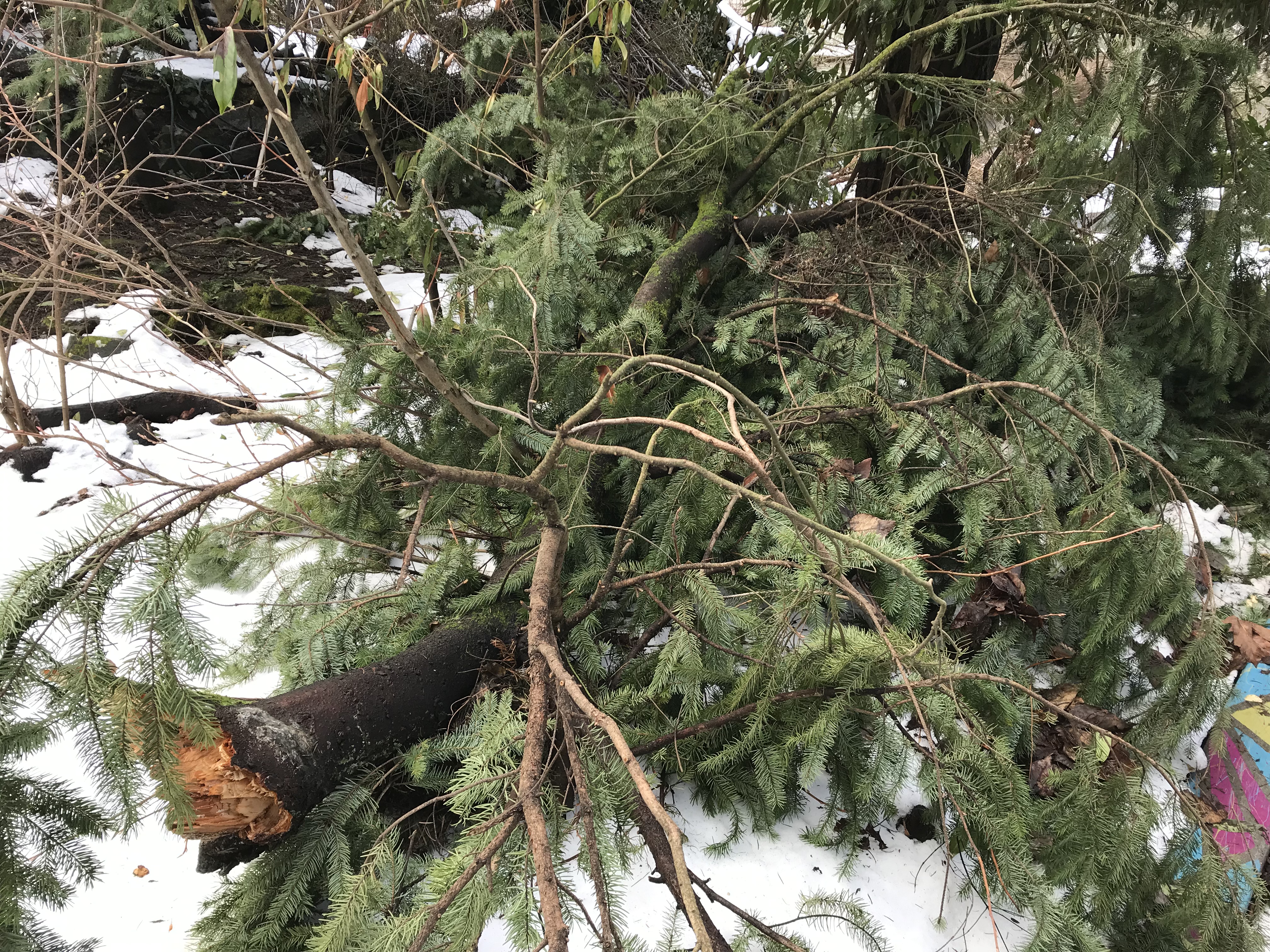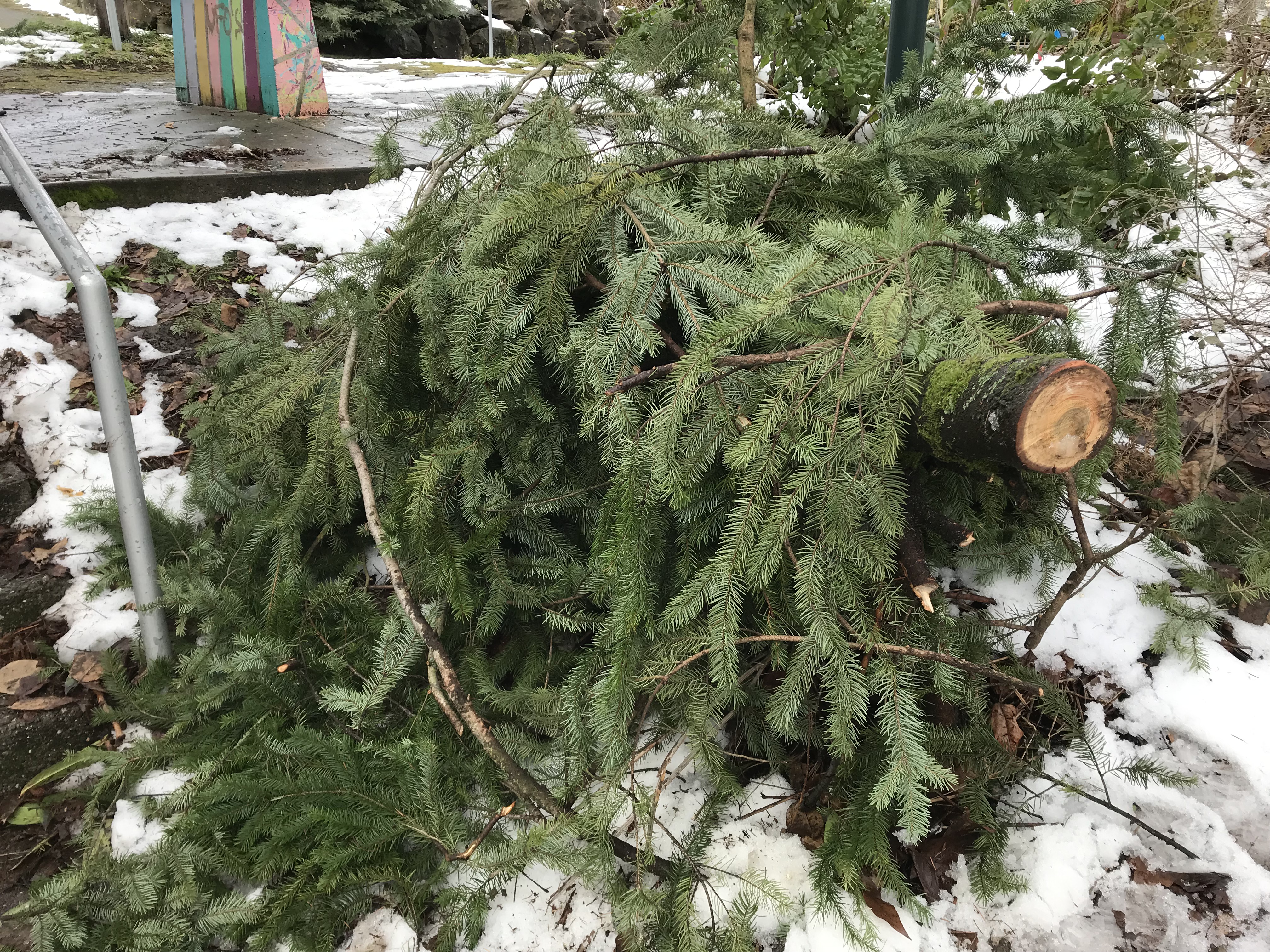 Last week, I heard that a Greenbelt tree had fallen onto the Hanford Stairs. When I walked through the snow to that area, I could see that branches had fallen, but they didn’t cover the stairs. I didn’t feel safe walking any closer to the stairs than I was; the snow was too deep and slippery.