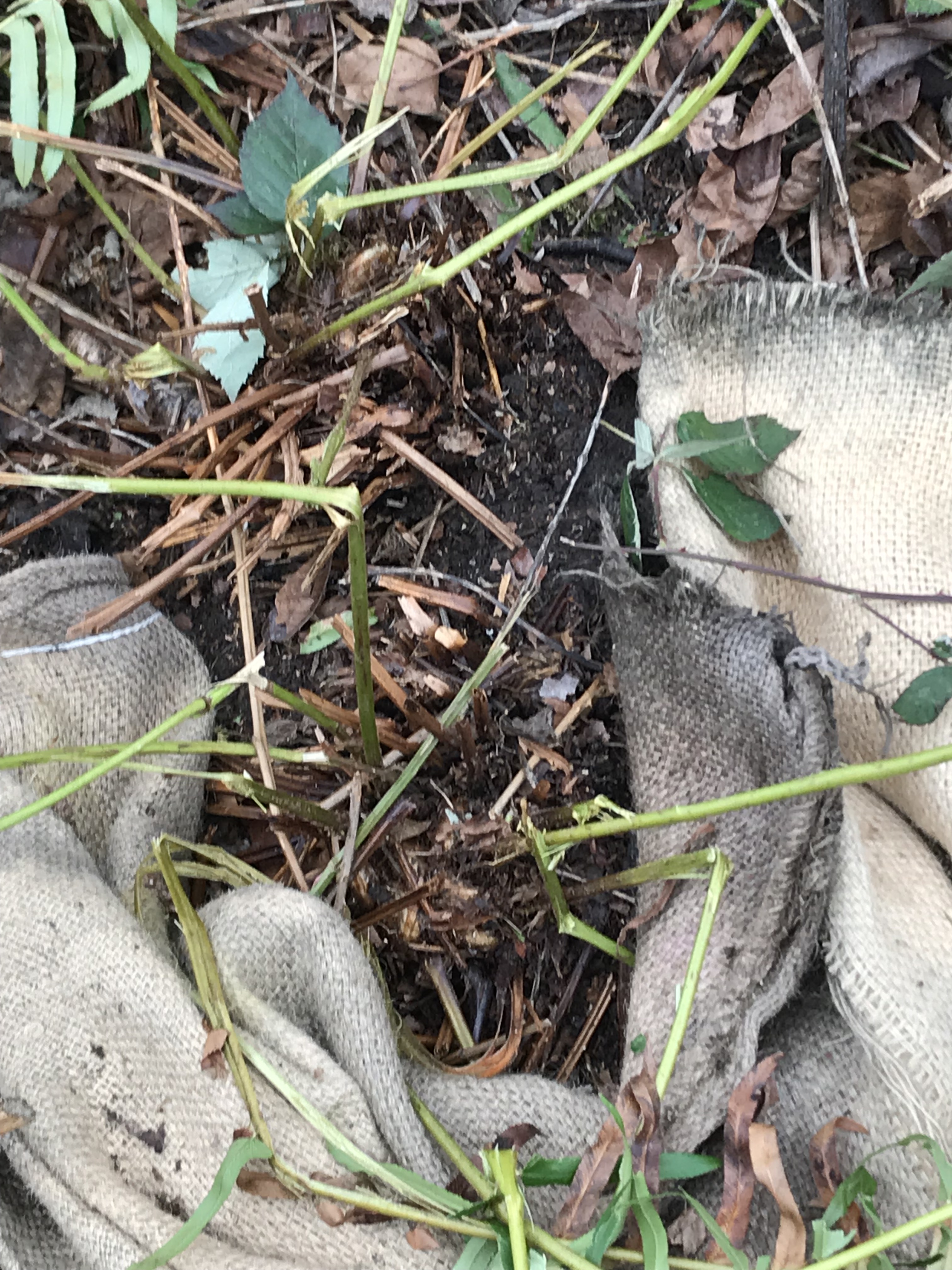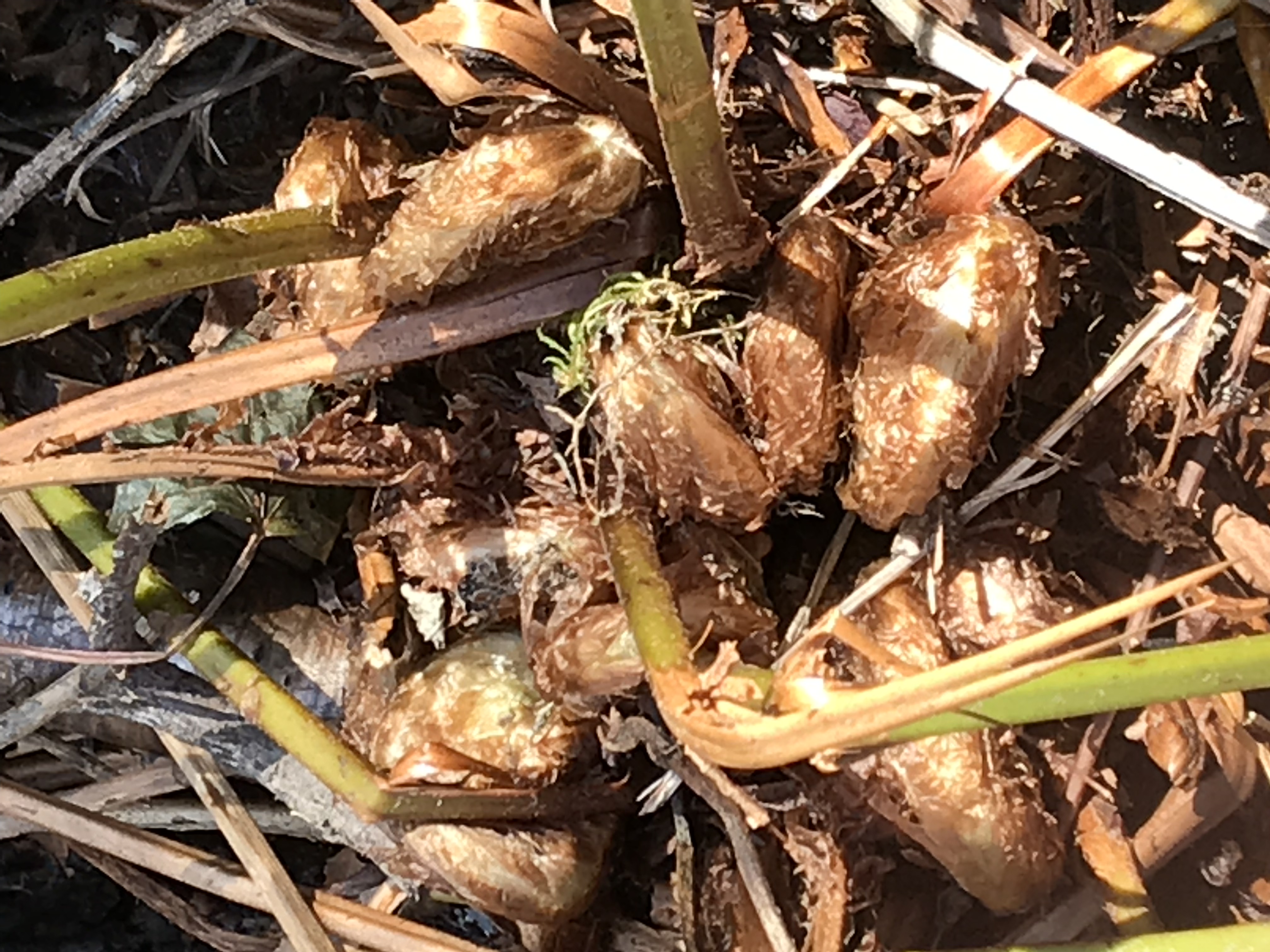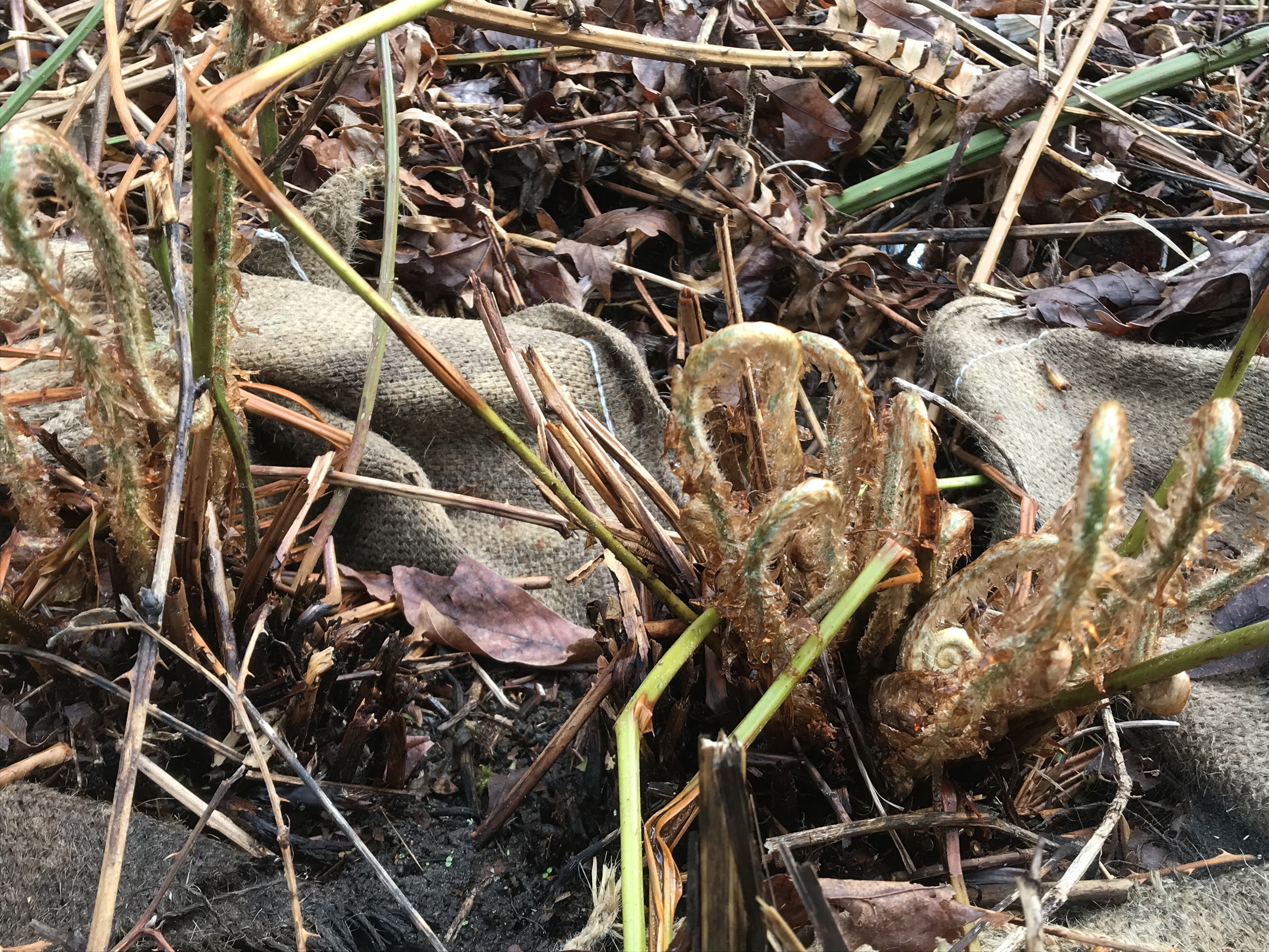 I’m excited. I’ve been watching two ferns beginning to awaken since one of our teams took all of the blackberry vines off of them in early March. They are so close together you can’t really tell that there are two of them. This is what they looked like today!