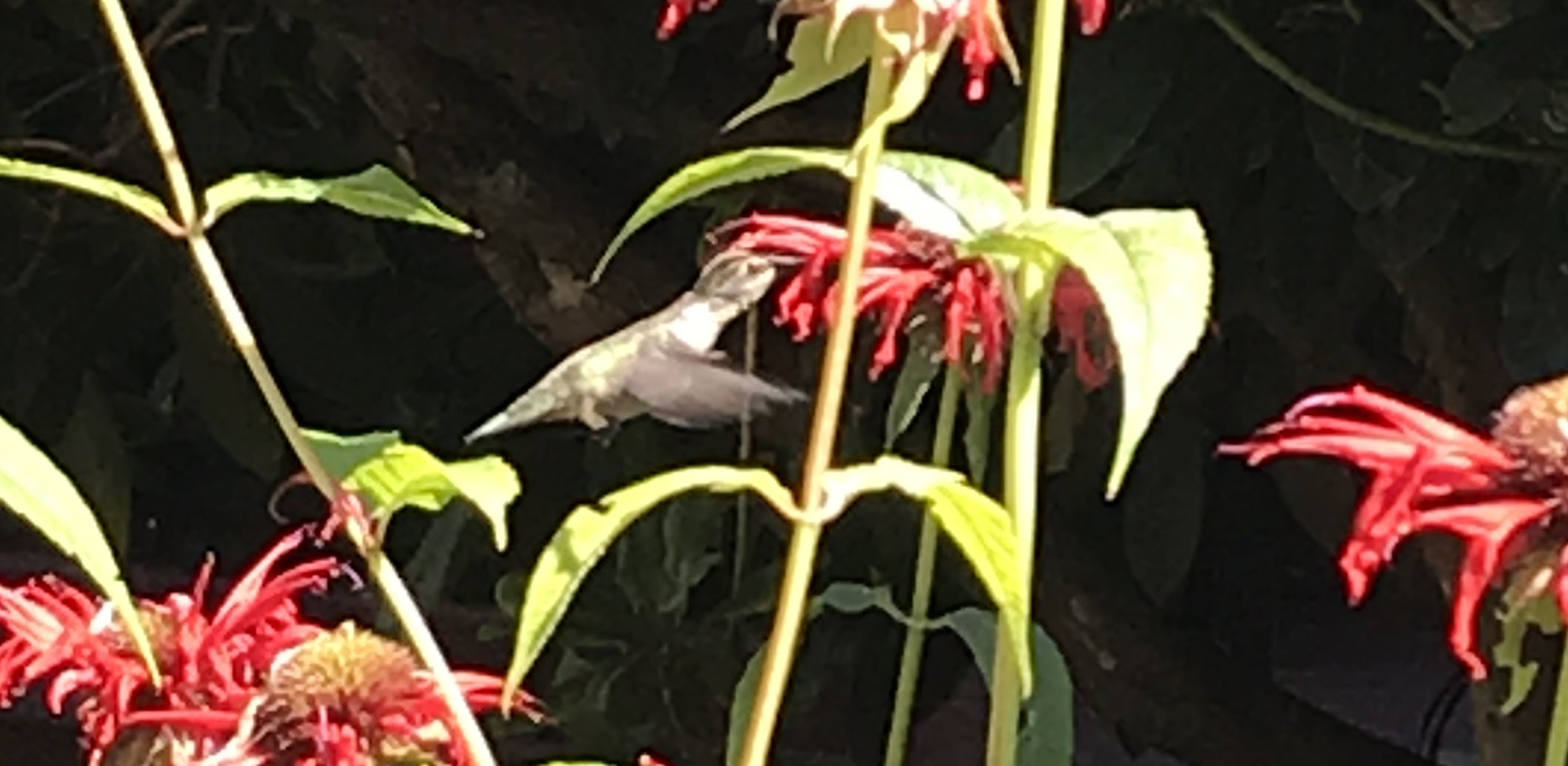 I don’t seem to have a copy of the bee balm flower I took earlier in the summer but I took one this week of a frequent visitor to that plant. I wish the photos were clearer but the hummingbird moves faster than I do.