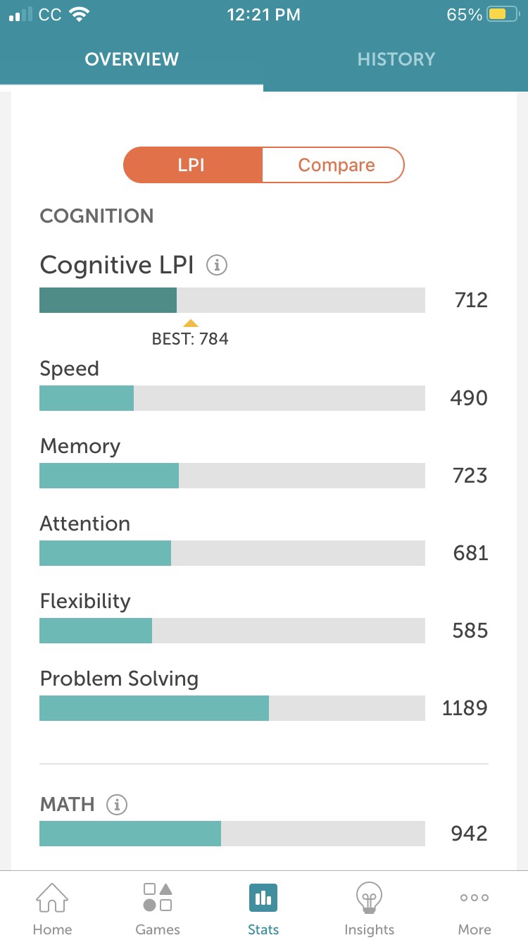 Each game focuses on an area such as speed, problem-solving, attention, divided attention, memory, flexibility, etc. I am fascinated to see that even though my scores are lower than they used to be, I have the same strengths that I had when I played them before. My highest scores are problem solving, attention, and memory. My weakest area was speed in the past and it continues to be lower than other areas.