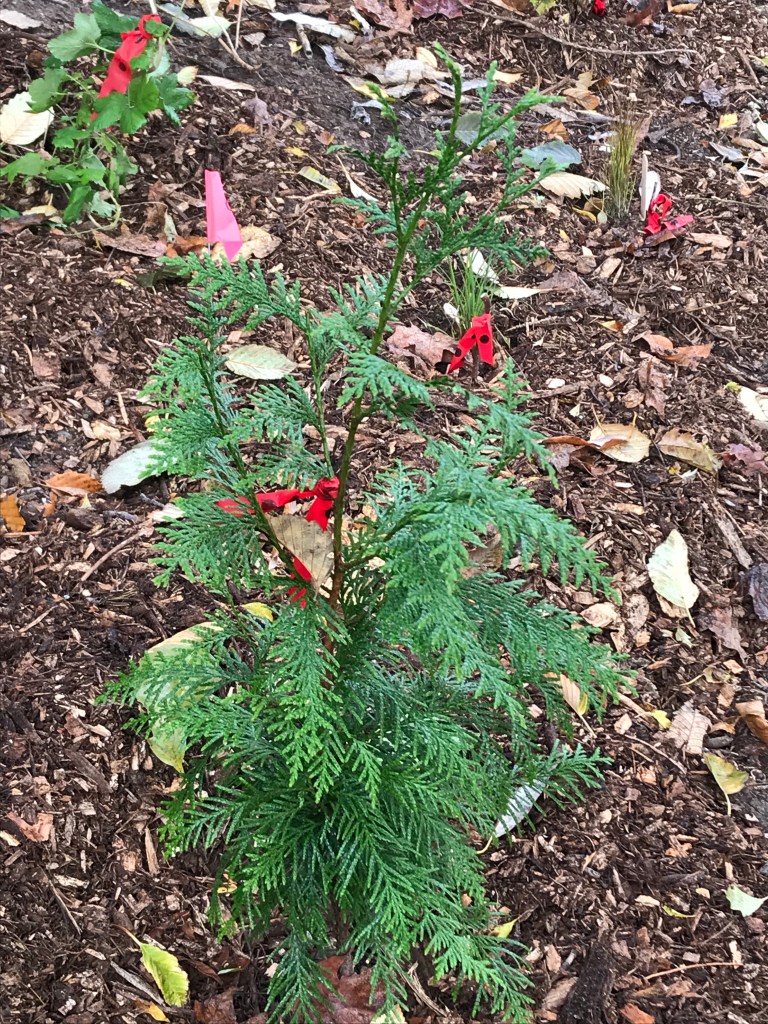 Neither Shirley nor I had taken any photos of the group that had cleared weeds in the planting area near the wood chip pile earlier in the work party but I did get one of what the area looked like after it was cleared. Imagine the area in the photo below with 100+ invasive vines emerging from the ground and you will get a sense of what it looked like at the beginning of the work party.
