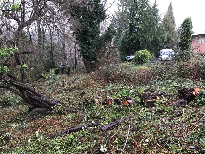 During the work session big blackberry vines and little ones were removed. This is a photo of one area before we started the work.