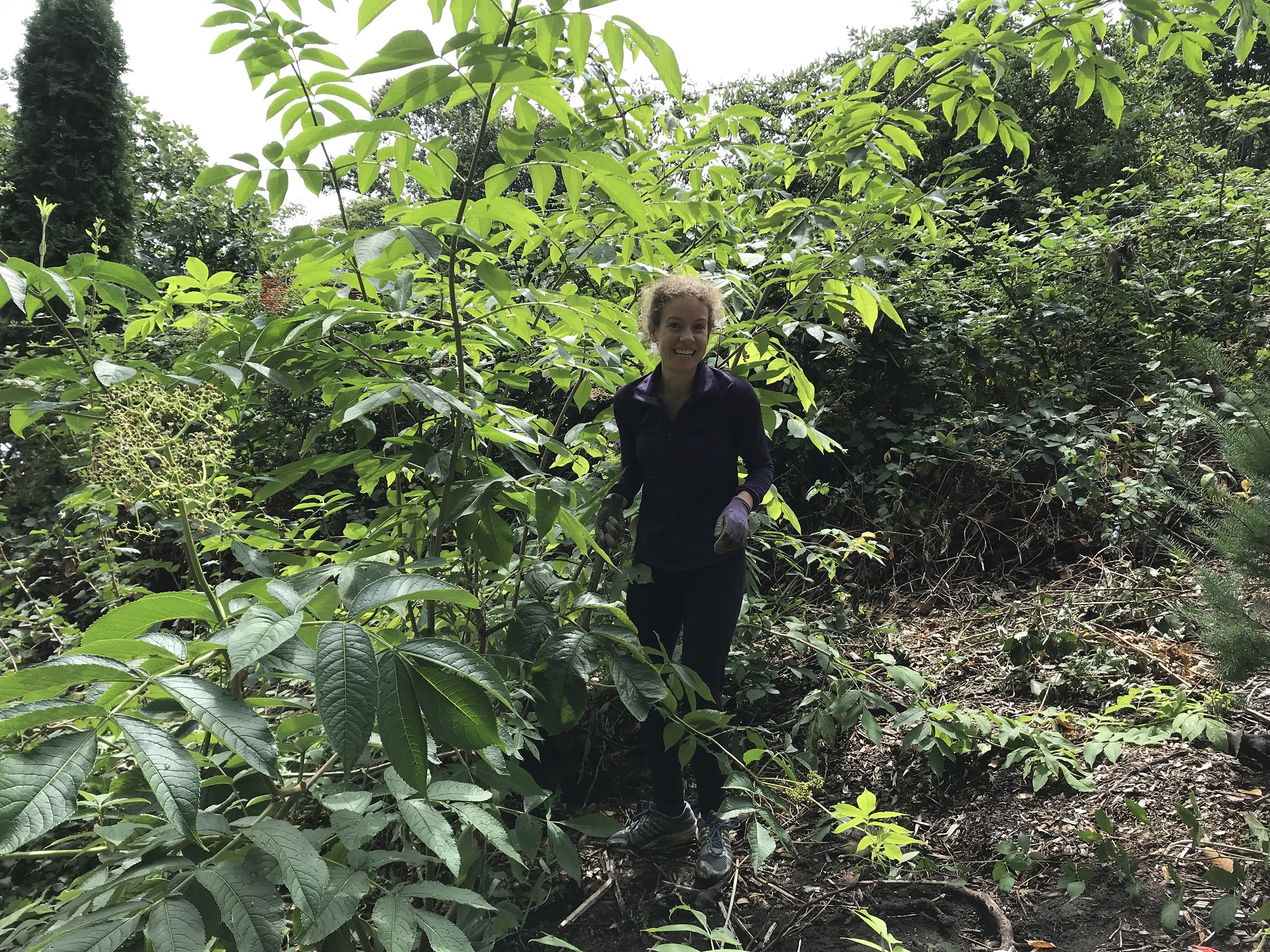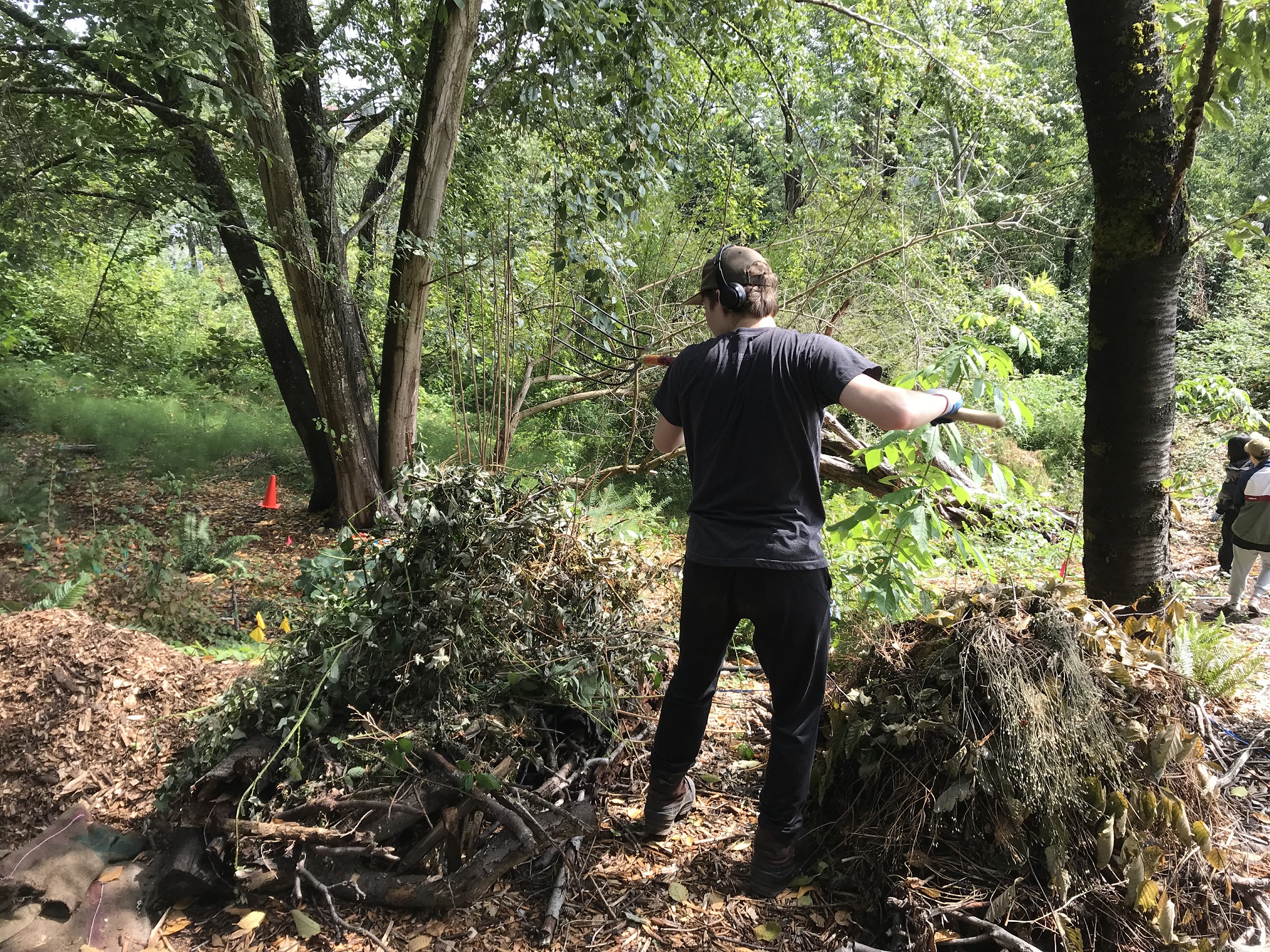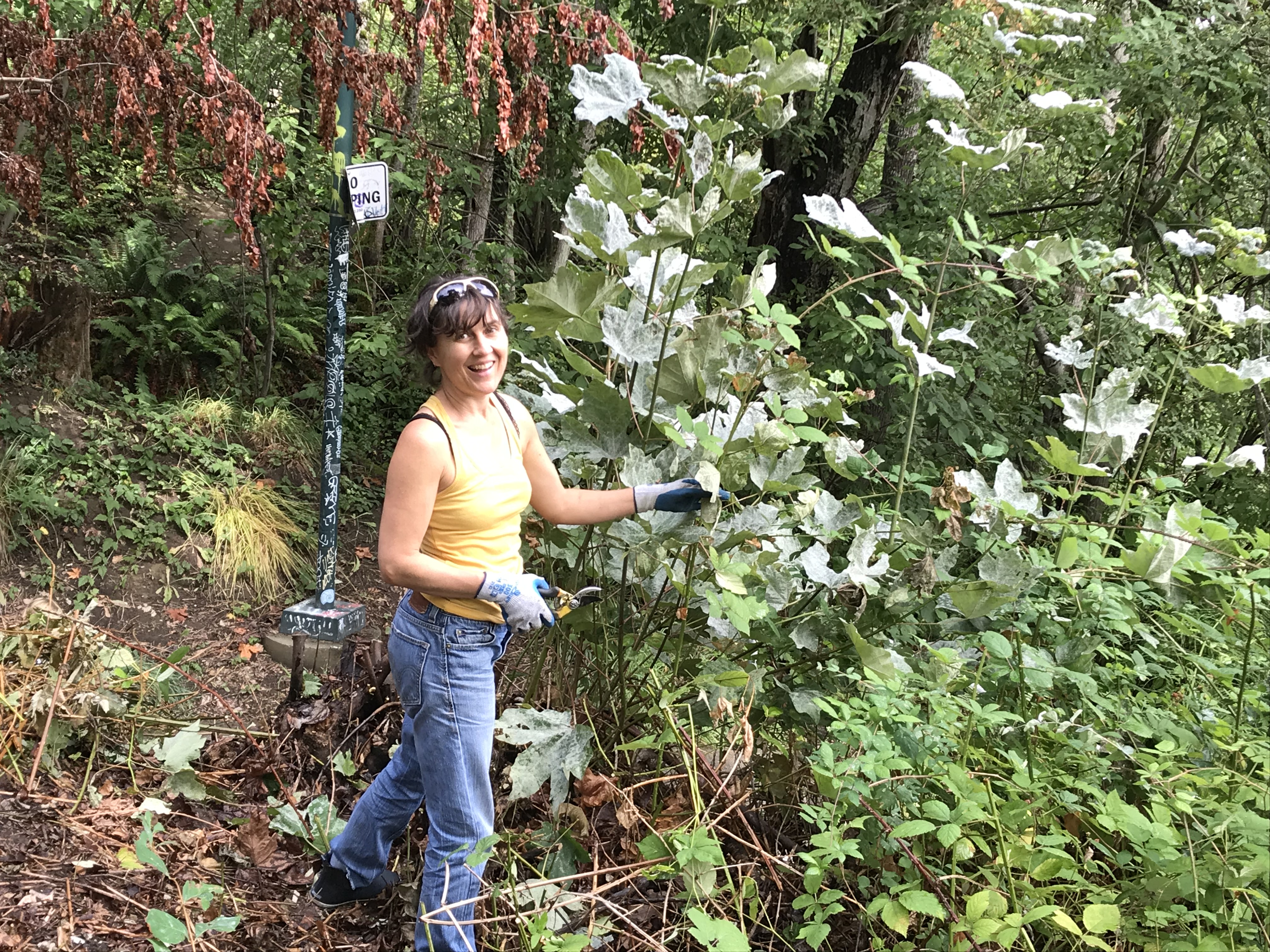 After a break, the group split into two teams. One team focused on removing the bindweed, and suckers that were shooting up from stumps of maple trees, in areas that border the Hanford Stairs. The maple trees had been cut down at some time in the past because they were under power lines.