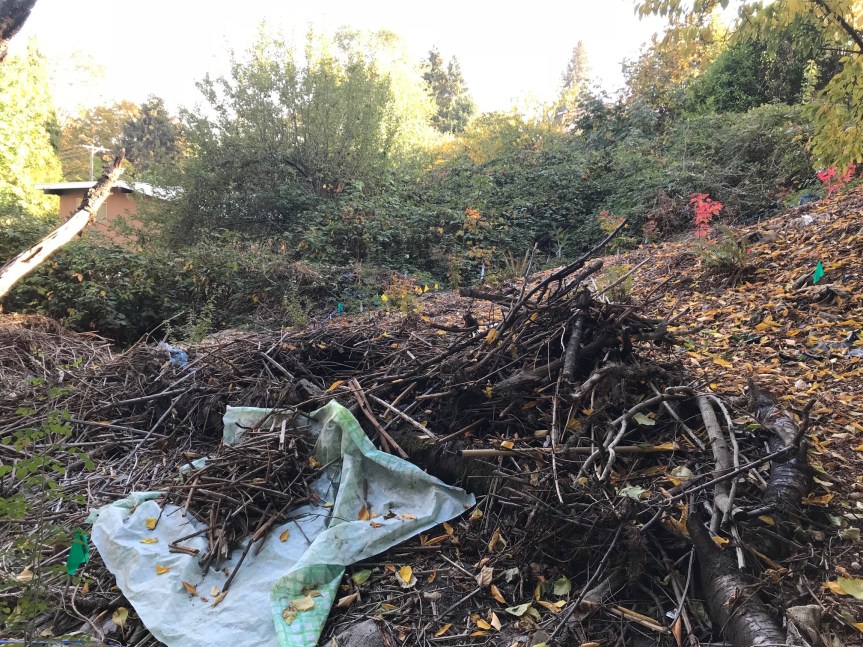 Every week this debris pile gets smaller. When we started on September 30, the pile was 4-5 feet high and you couldn’t see the planting area on the other side of it. Now the western part of the pile has branches that are too big to be cut with hand clippers. The rest of the pile is about 2 feet high and you can easily see what is on the other side of it.
