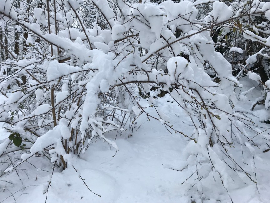 I knew that the little Greenbelt trees that were bent over from the weight of the snow would be bent over again so I walked into the Greenbelt from the Hanford Stairs. The weight of the snow on one of the shrubs created a canopied entrance to the site, I felt like I was entering a magical land.