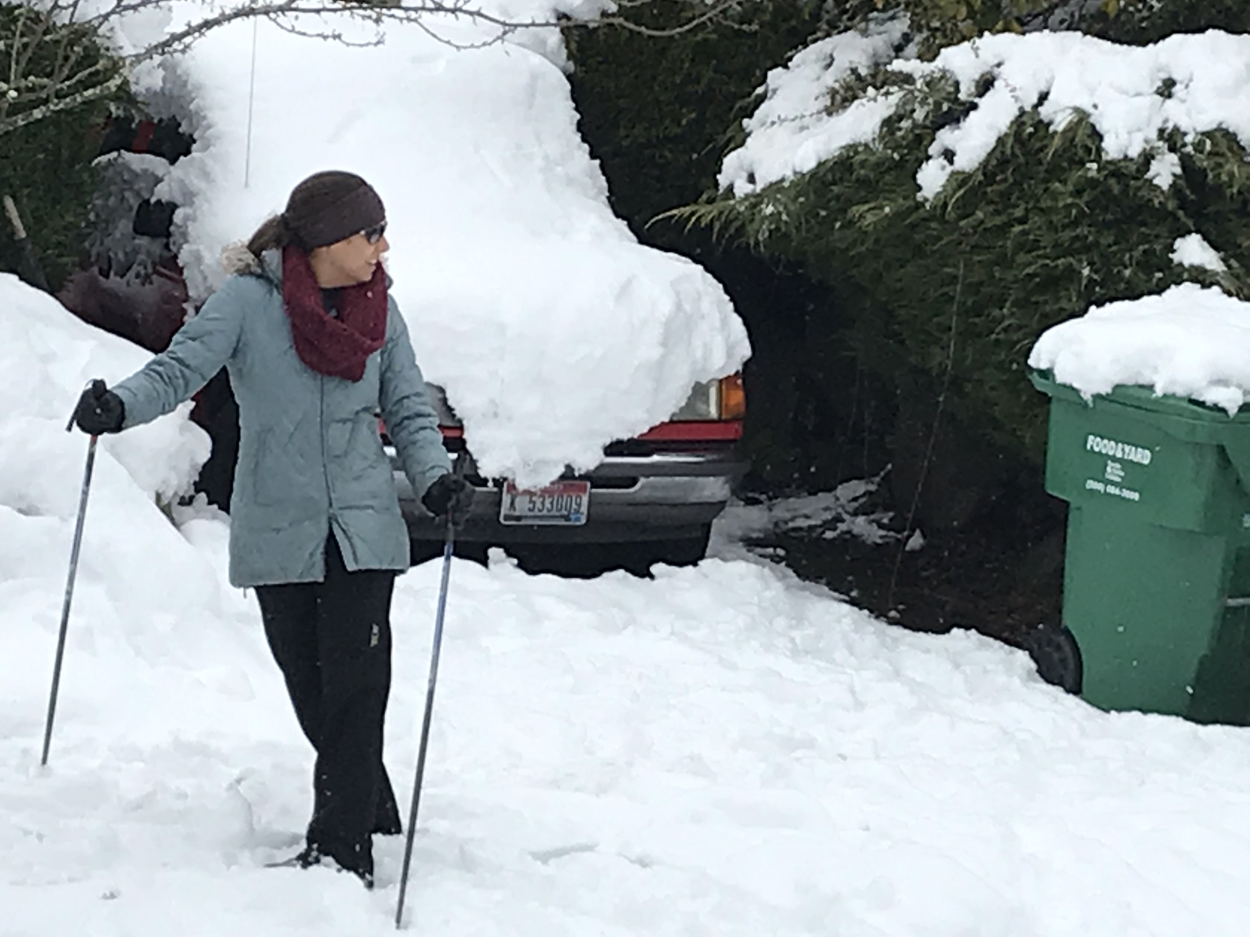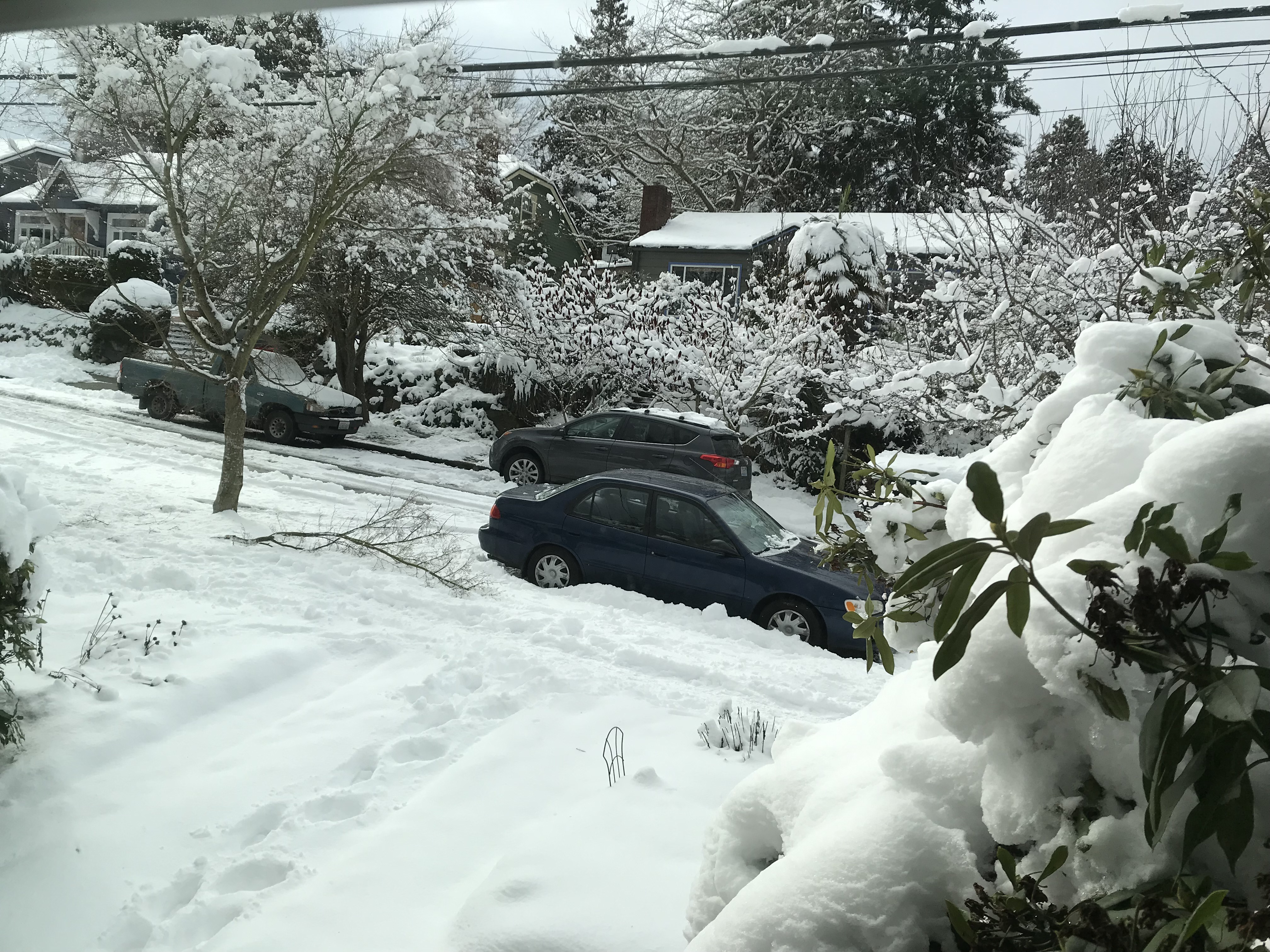 After leaving the Greenbelt, I saw a neighbor who was about to walk down the hill to the store. As we talked, we noticed that people were try drive down 25th Ave S where a tree had fallen across the road the night before. When they turned their cars around, they almost all discovered that they couldn’t get up the S. Hanford hill. Most couldn’t even make the jog in the road at 25th Ave. S and S. Hanford. We guided the motorists to a place where they could park their cars until the roads were drivable for a while.