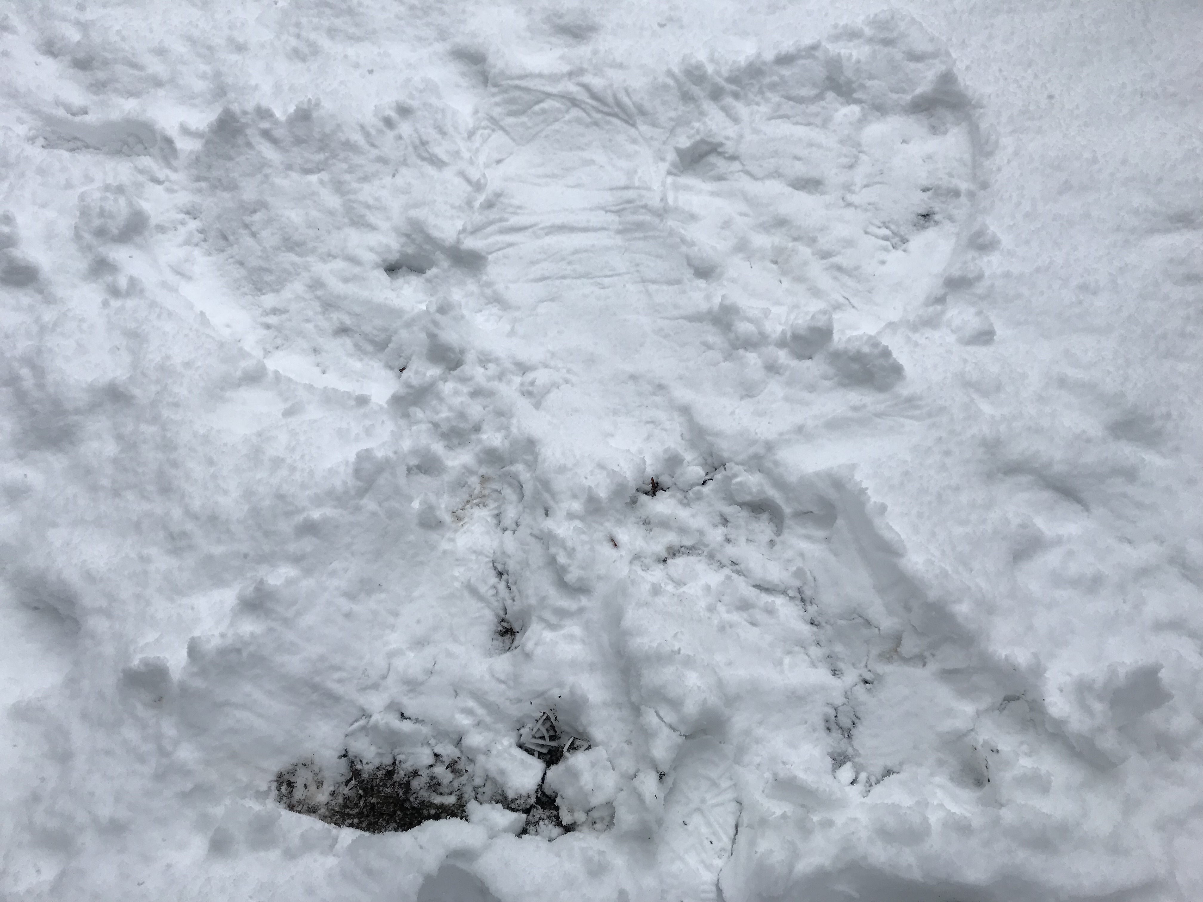 Seeing those objects made me think of the snow angels I used to make when I was a kid. I kept thinking of them throughout the day. Eventually, I decided I was going to do it! It was a lot easier to lie down than it was to get up. I thought it interesting that the size of the right wing reflects the trouble I am having with my shoulder.