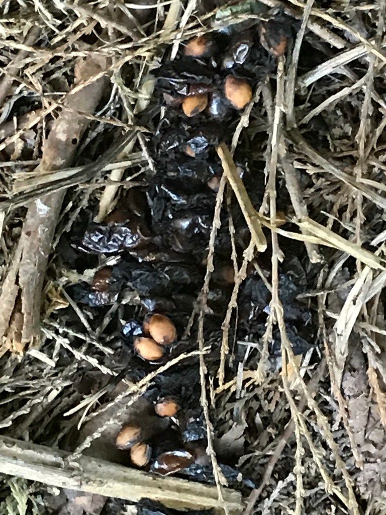 Ah ha….. I hadn’t noticed anything peculiar about the first droppings but the last set were full of seeds/pits. Since there are big cherry trees on the property, and the cherry’s are ripe and falling, the animal had more than likely been eating cherries. My conclusion was that the pile was probably left by a raccoon, possibly a raccoon with diarrhea from eating too many cherries!