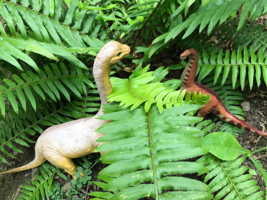 I suppose once the fronds get bigger, their weight will bring them down and the plant won’t be as high as it is now… but I wonder if the dinosaurs will ever be able to see each other through the fern again.