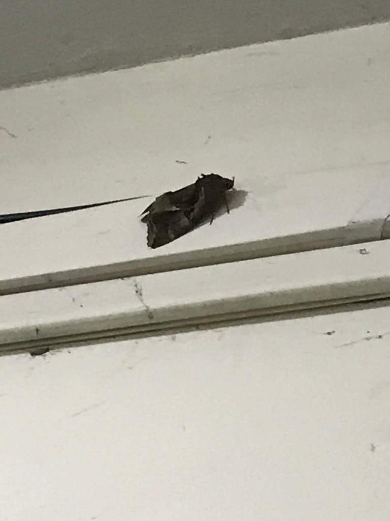Yesterday was the first day since I’ve been here that I didn’t take a nap. As I walked back to my room around 9:30 p.m. I noticed something on the wall ahead of me. I had no idea what it was so walked closer to it. In that moment, it flew off, drawn by a nearby light. I realized it was a gigantic moth. It must have had a four inch wing span, or at least that was what it seemed like in the short time I had to observe it. I walked away so I could look at it from a distance. In a minute or so, the moth flew back to the wall. I walked back to take a photo of it.