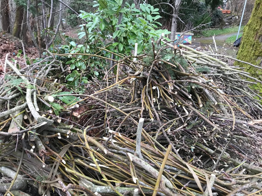 After the break, we all moved to the Greenbelt site that is north of our main site. We started by moving a drying rack that had accidentally been constructed in the place where future wood chip piles would go. I was amazed to see that the blackberry canes and other invasive plant cuttings that had been placed on it were already dry. We used that dried debris in constructing the new rack.