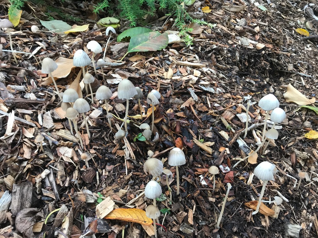Yesterday, as we were walking down the stairs that separate my yard from the restoration site, one of our team leaders pointed out some mushrooms to me. I thought the fact that they were coming up through a coiled hose made them look like a piece of art.