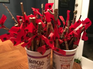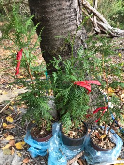 Prior to this work party, the shrubs and ground covers had been separated into ten groups, each number assigned to the planting area where the plants will be placed in the ground. The trees were grouped separately.