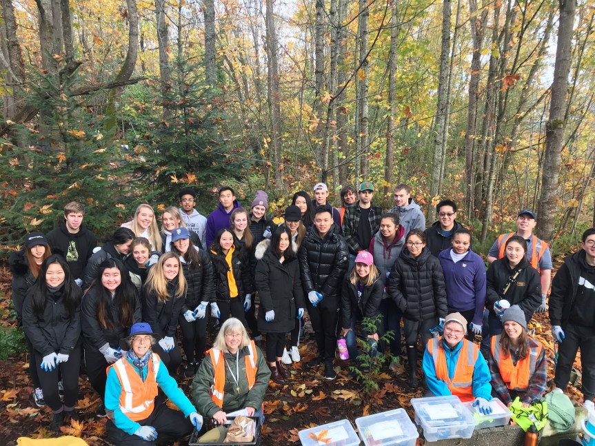 The November 10th work party was one of our biggest. Six team leaders, four of which were Green Friends members, four neighbors, and 29 students from the UW Introduction to Environmental Science class participated.