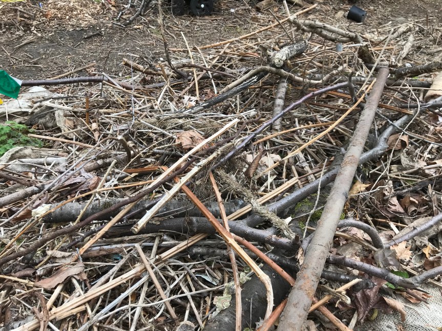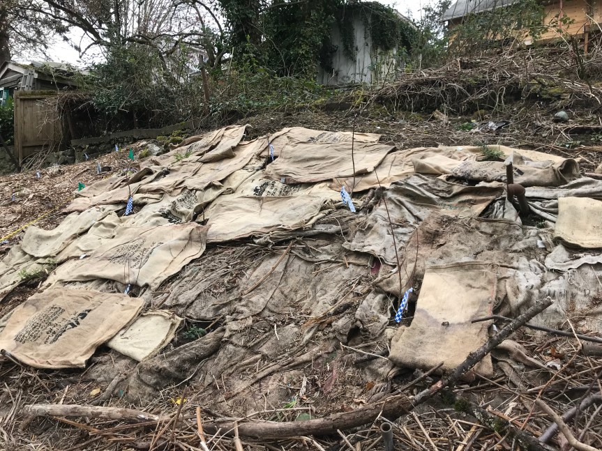 as I was walking up and down a slope to place burlap on areas that we are going to cover with wood chip mulch on Sunday. There is a shrub planted every place you see the blue and white checkered tape. Some of the plants haven’t been marked yet.