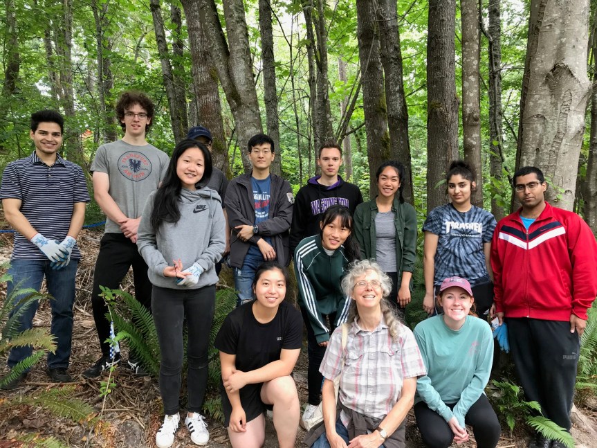 The July 5 work party was very small, probably because I scheduled it for the morning after the 4th of July holiday! Two GreenFriends members and four student volunteers from a UW Environmental Science class participated. The GreenFriends members served as team leaders, teaching the students what they needed to know, doing organizational work, and at times working alongside them.