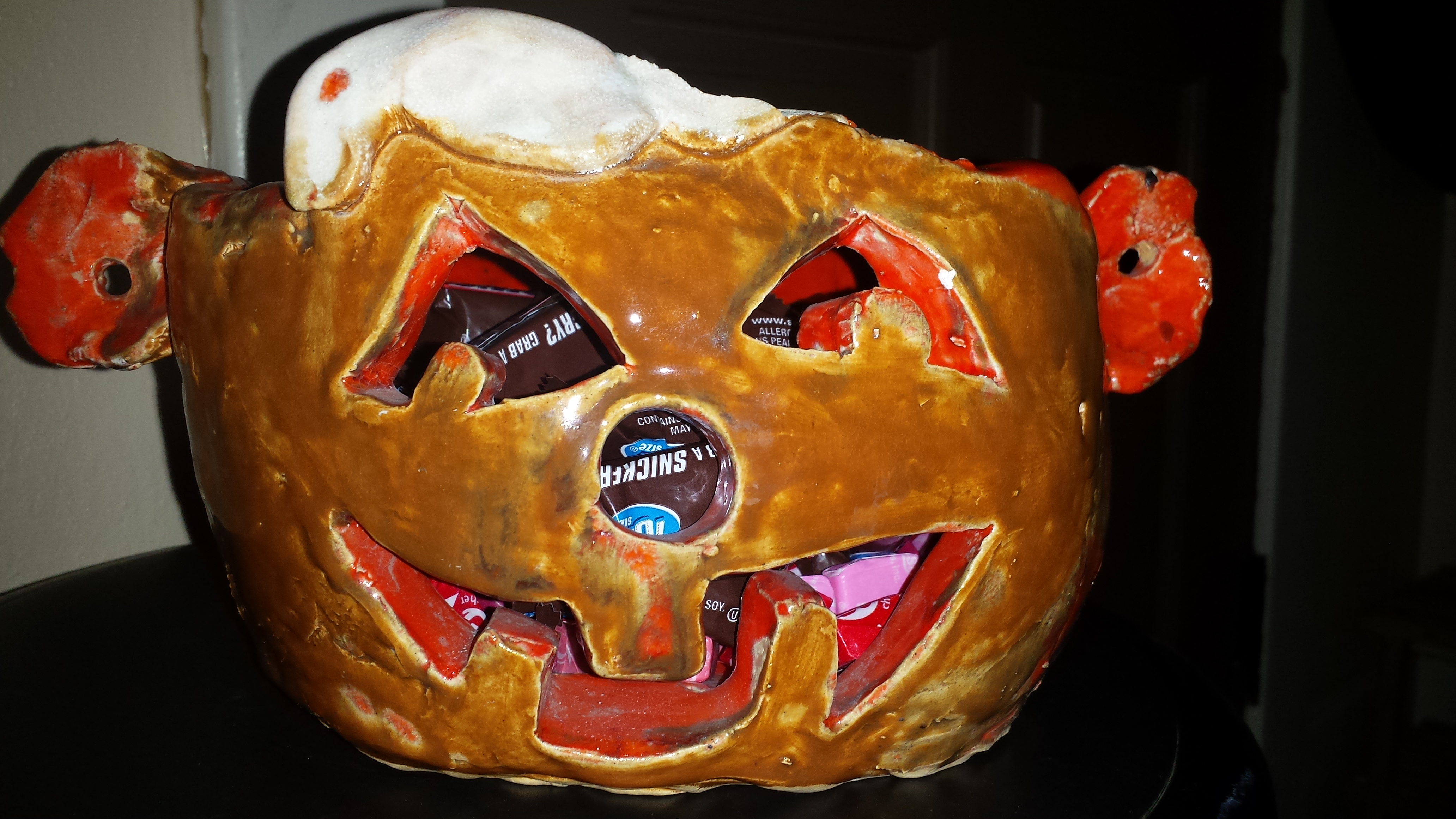 As I filled this jack-o-lantern with candy for the trick or treaters who will soon be coming, I realized I had the object for this week’s Weekly Photo Challenge. My son, Sreejit, made this beautiful piece of art when he was five-years-old. It has held treats on Halloween for the last 35 years!