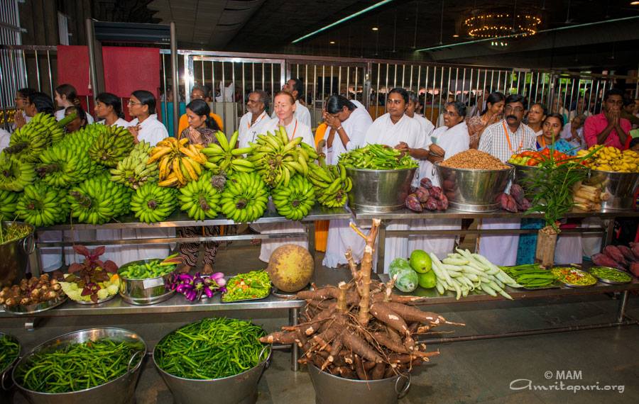 I hadn’t seen it at the time it occurred, but when I looked for the pookkallam photos on the Amritapuri Facebook page, I learned that on Sunday a display of organic produce from the ashram gardens (which would be used in cooking the Onam dinner) had been created so that Amma could see the harvest.