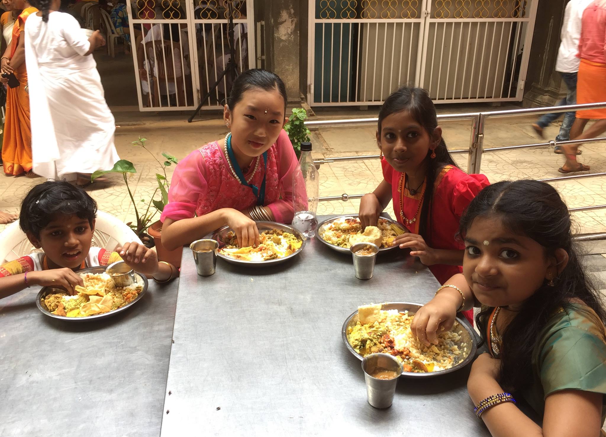I’m hoping I will be able to show you a photo of Amma serving the food in a future post, but here is one of some children enjoying their lunch. The cups have a sweet pudding in them. [In Kerala people usually eat with their hands rather than utensils.]