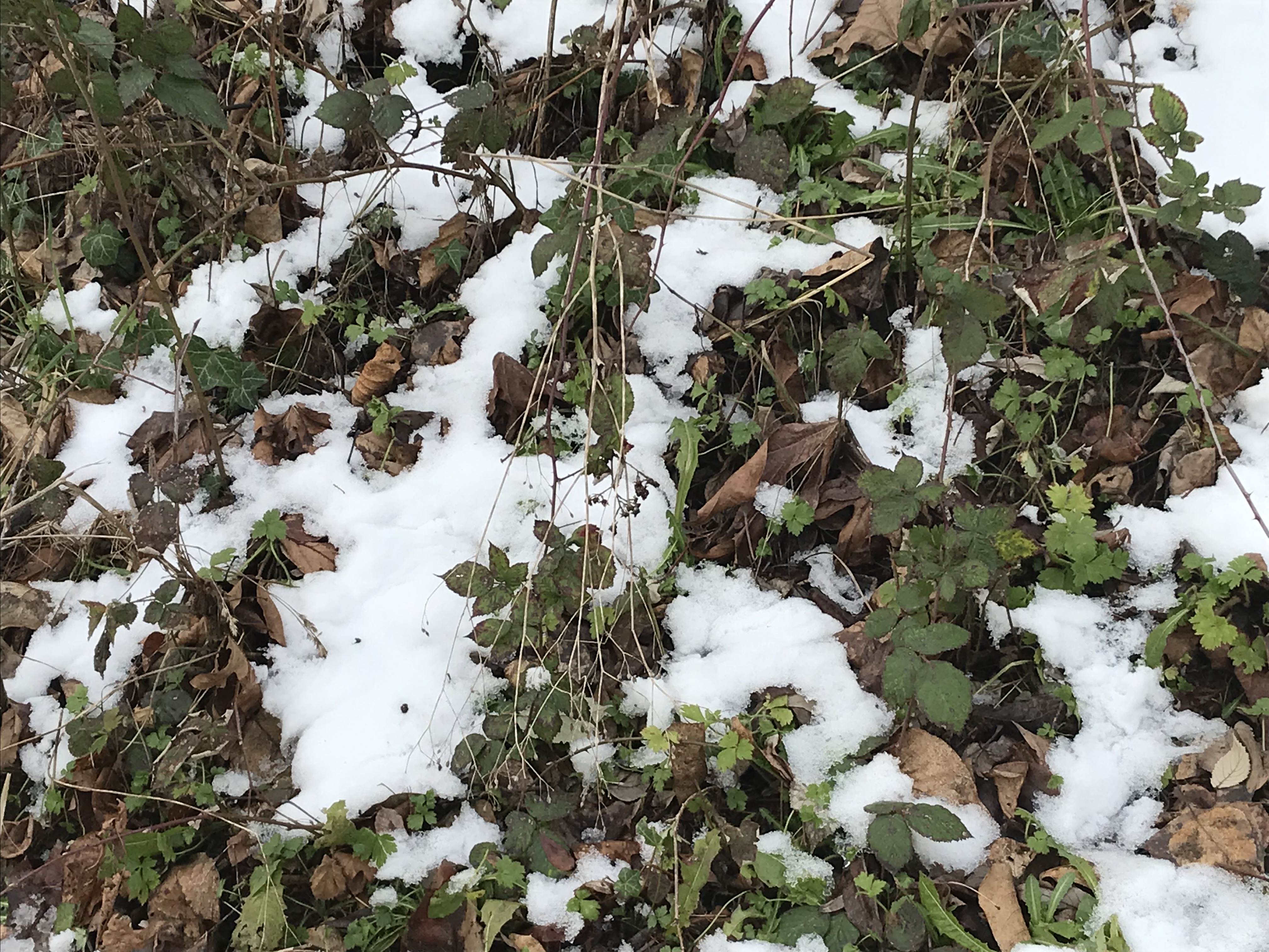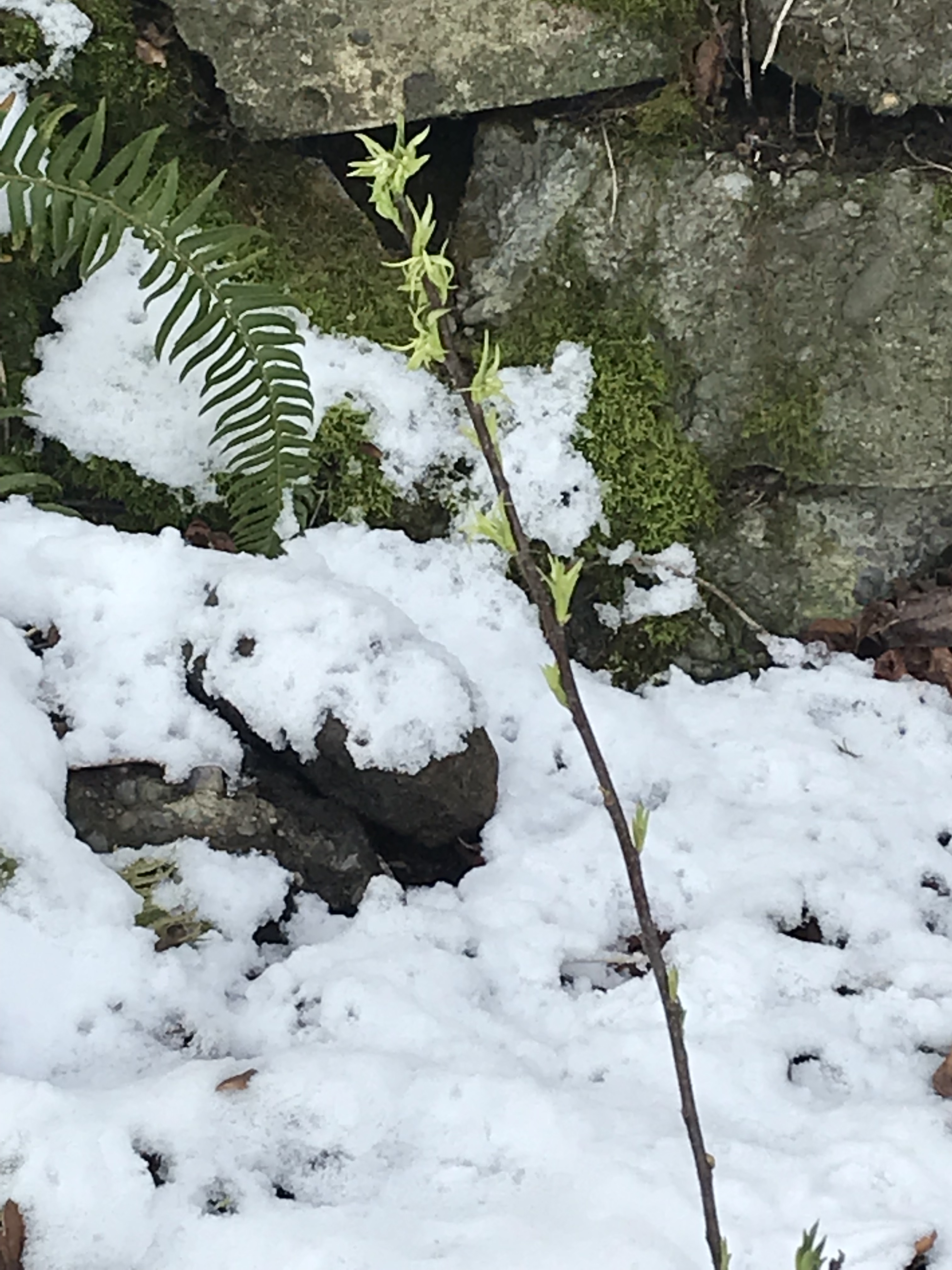 I’ve been worried that the snow will hurt the shrubs that are already leafing. I was relieved to see that this one looks fine.