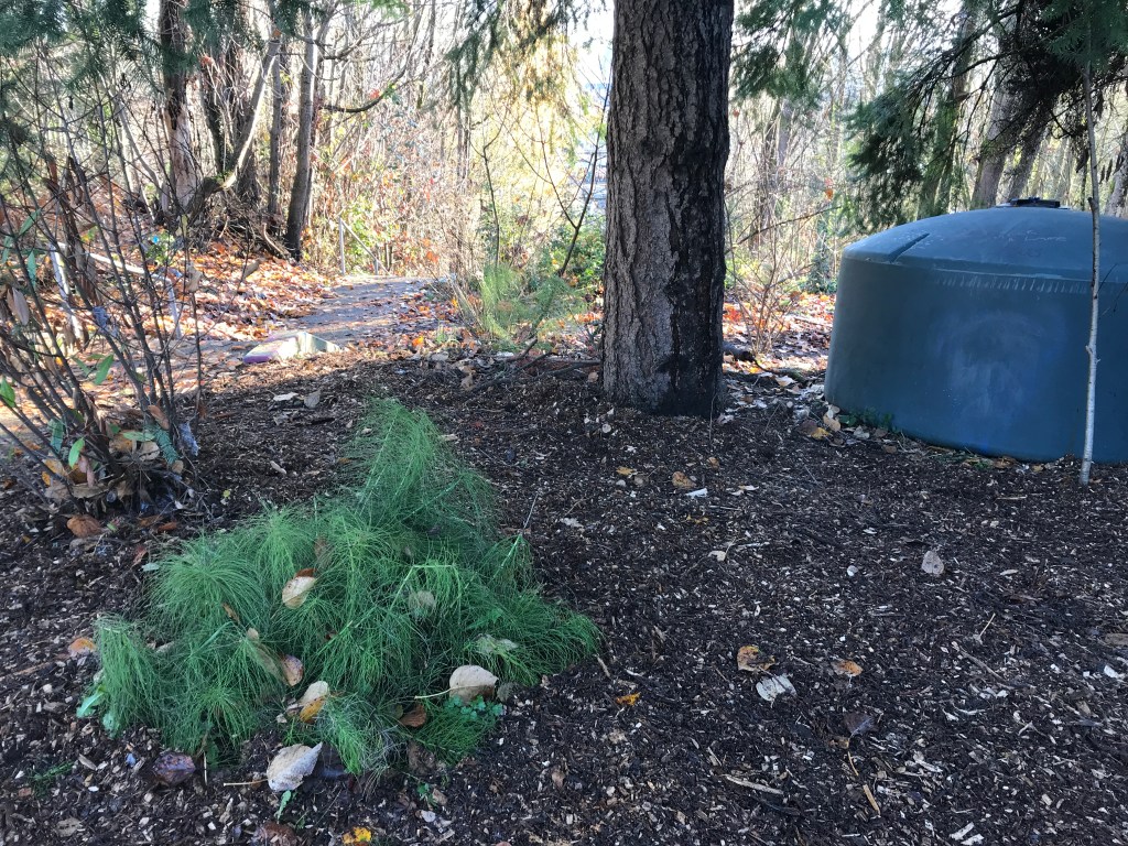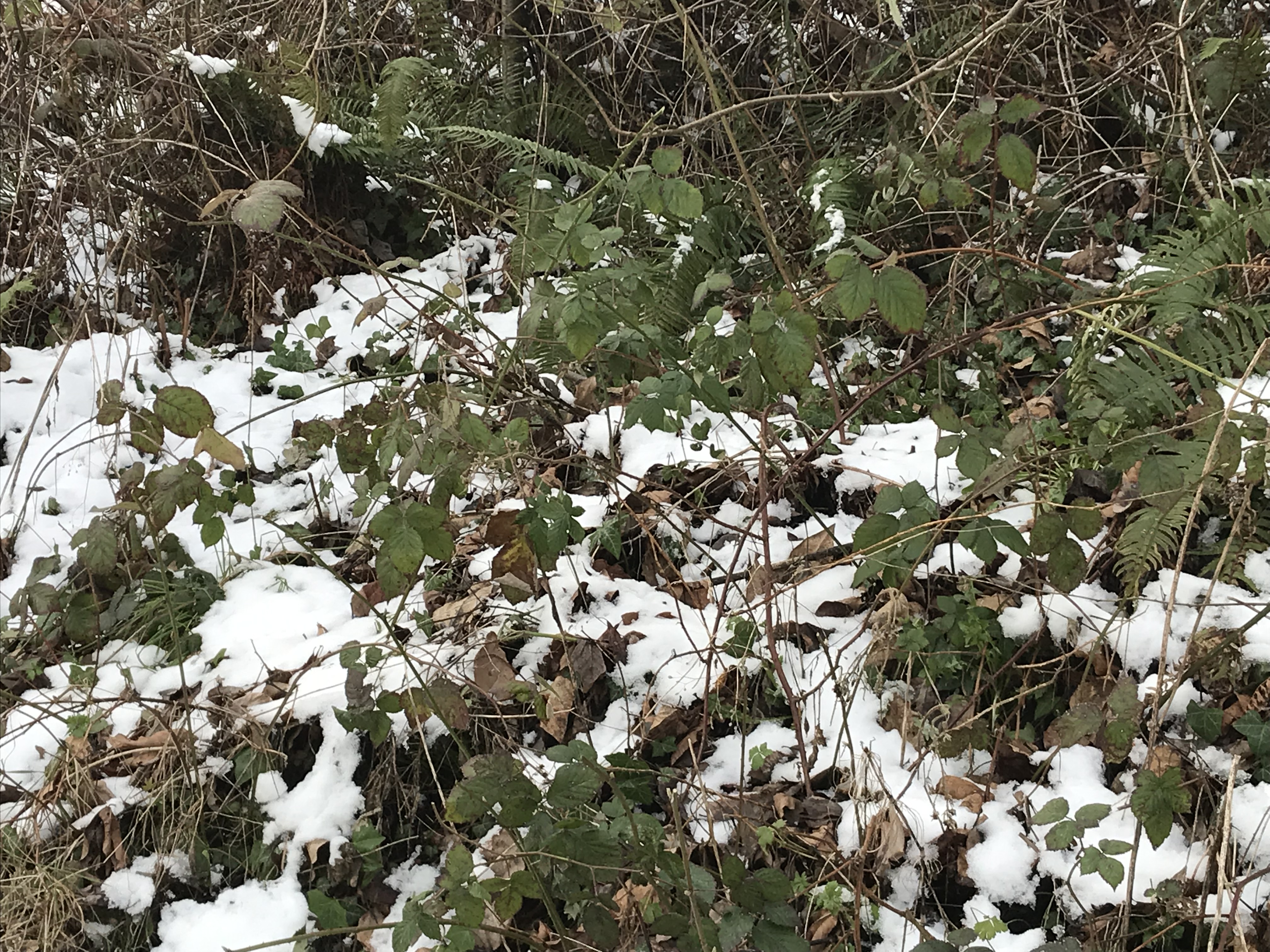 I have no illusion that the bindweed is gone but there is sure a lot less of it and the land we cleared looks wonderful. We had removed the bindweed from the area around three salal shrubs and two snowberry shrubs and circled them with wood chip rings. A few days later, I saw mushrooms had emerged from the ground a little lower on the site.