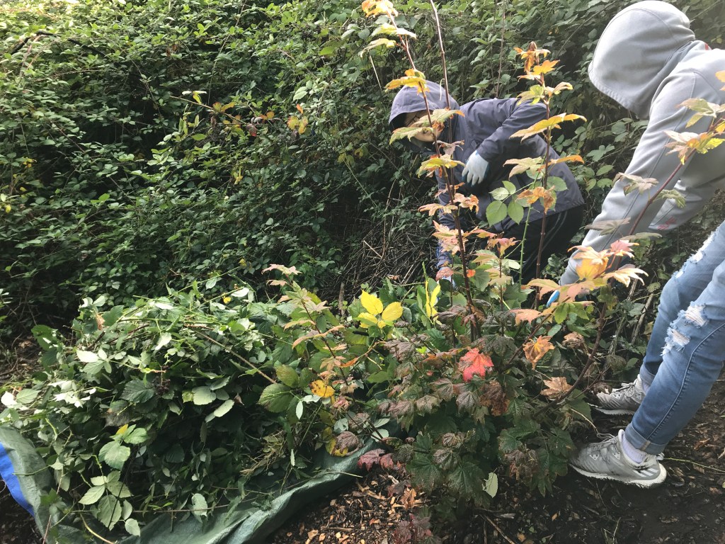 After a break, the students removed a big pile of dried cuttings from another area, and took them to a different part of the site where they will break down even further. We will be able to plant shrubs in the space where the large pile of debris the students moved that day once stood.