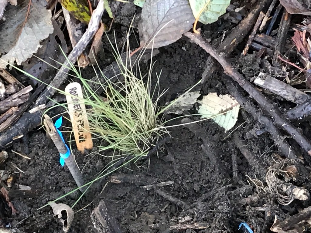 We decided we would begin another foundation planting experiment during the November 19 service-learning session. We would plant 5 tall managrass and 4 Roemer’s fescue plants along the southern and western inside borders of the foundation’s walls.