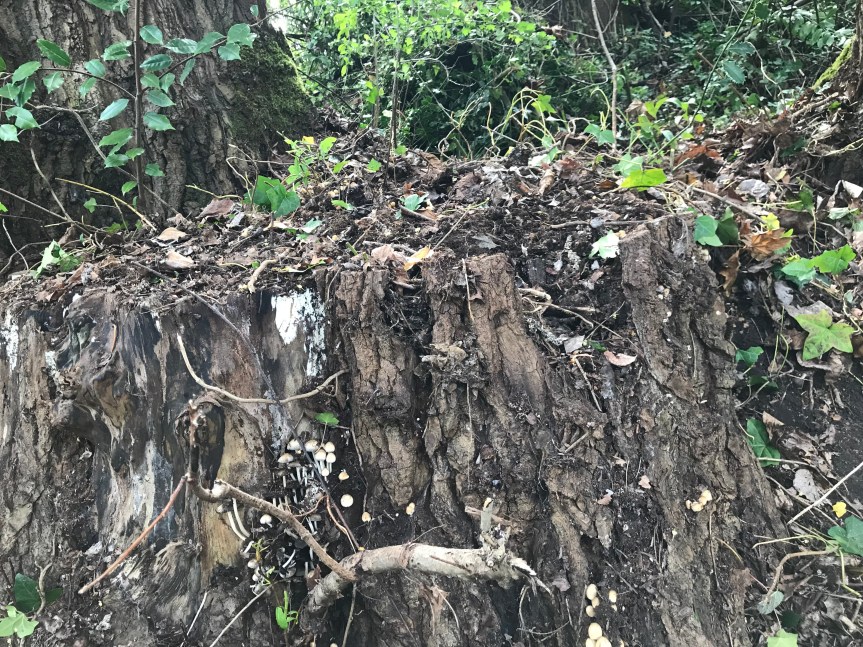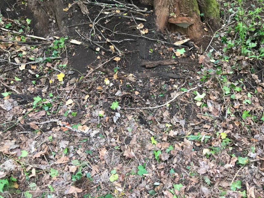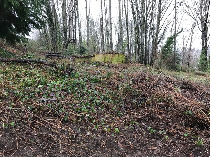 The third team was comprised of the team leader and three other volunteers. They worked in an area that is north of the site we’ve been restoring. In three hours time, they cut survival rings around eleven trees! In addition, they began to remove ivy and blackberry vines from the land in the vicinity of those trees. [Note: Ivy kills trees. We create a survival ring by removing ivy on a tree from ground level to shoulder height. That way the ivy that is higher up will die off without creating the risk of pulling dead or dying branches onto ourselves or other people.]