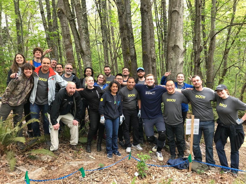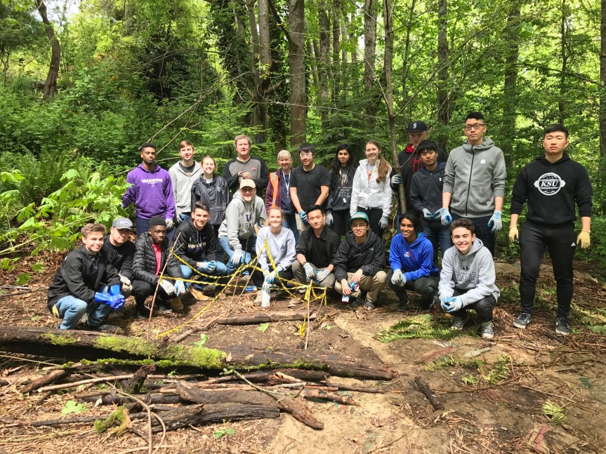 Twenty-five additional volunteers had pre-registered through the Bridge2Beach and Green Seattle Partnership event calendars. Twenty-one of them were from the U.W.’s Introduction to Environmental Science course. The UW students who had worked at our May 9 event could also be considered part of this collaboration since they did so much to prepare the planting sites for the work that was done on the 12th.