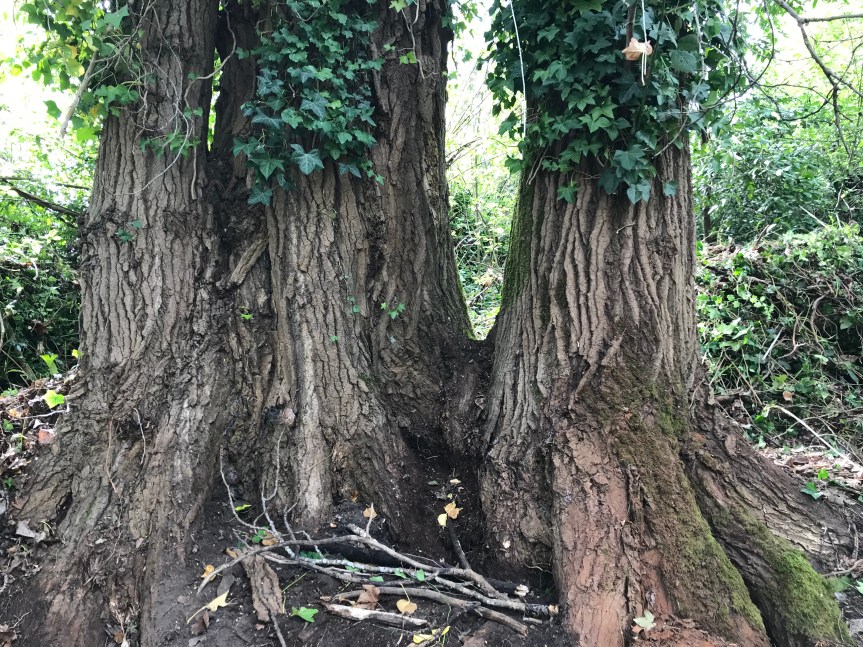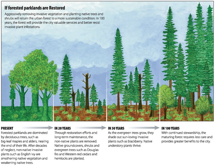o many trees this Greenbelt site have been killed by ivy. One of the first trees I focused on freeing from blackberries and ivy last September was the one in the photo to the left. It had a split trunk at the bottom and both trunks split again further up. The trunks/branches on the west side were dead; the east side of the tree had leaves.