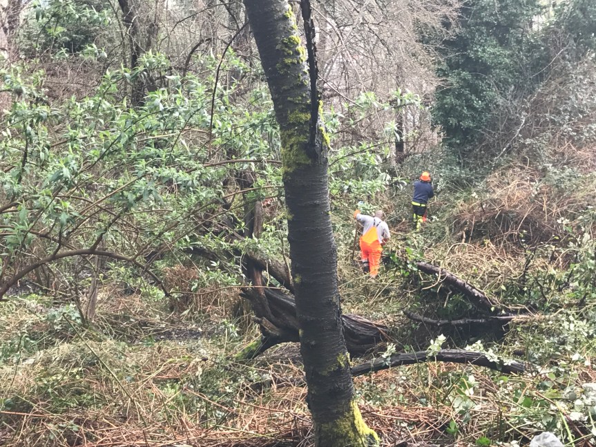 The third team was comprised of the team leader and three other volunteers. They worked in an area that is north of the site we’ve been restoring. In three hours time, they cut survival rings around eleven trees!  In addition, they began to remove ivy and blackberry vines from the land in the vicinity of those trees. [Note: Ivy kills trees. We create a survival ring by removing ivy on a tree from ground level to shoulder height. That way the ivy that is higher up will die off without creating the risk of pulling dead or dying branches onto ourselves or other people.]