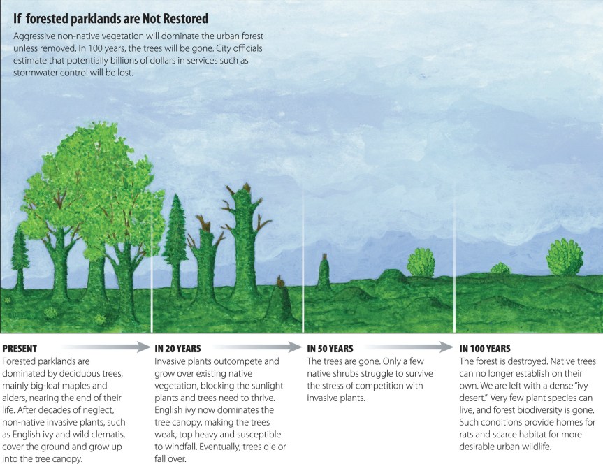 Throughout Seattle, there are groups of people working to remove blackberry vines, morning glories and ivy from parks and Greenbelts. The empty lot that is behind my house is in of one of the Greenbelts. During the last three decades, the invasive plants have completely taken over the once beautiful land. So many trees have died.