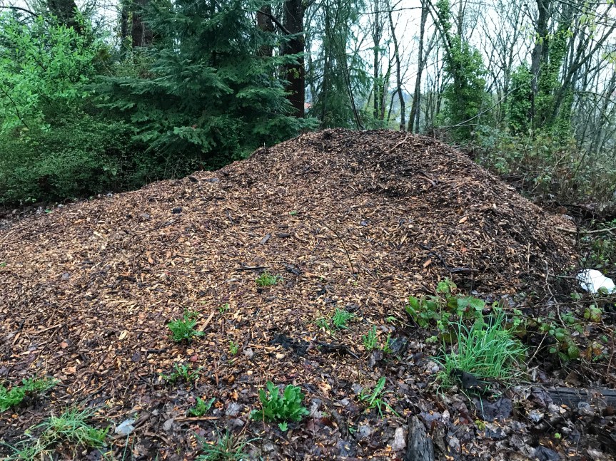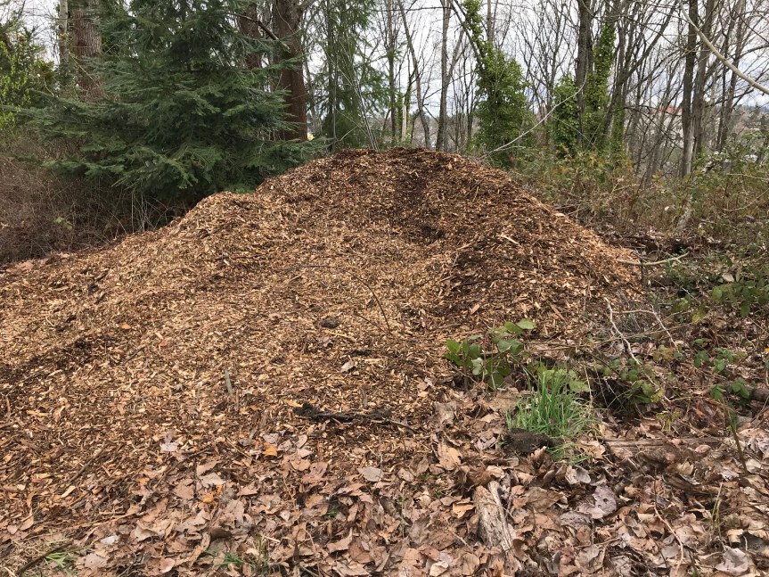 The mulch we were getting the wood chips from had been delivered on March 5. At that time, there were 15 cu. ft. of them and the pile was 6-8 feet tall. (Susan was standing on a slope so the pile was actually taller than it looks in the second photo.)