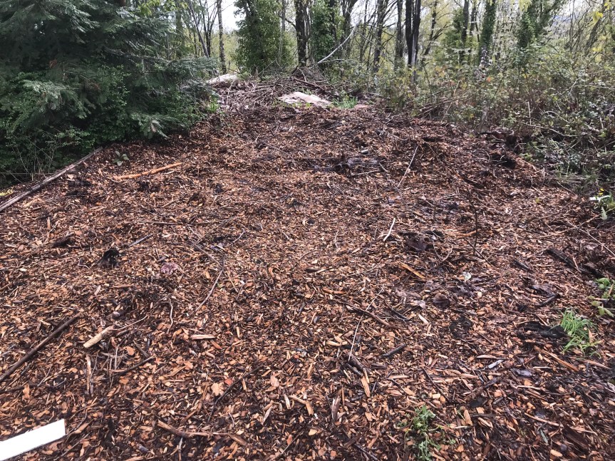 We have had three bucket brigade work parties since that time. I have enjoyed watching the pile decrease in size. I have no idea how many hundreds of buckets filled with wood chips have been passed down the line during those work parties.