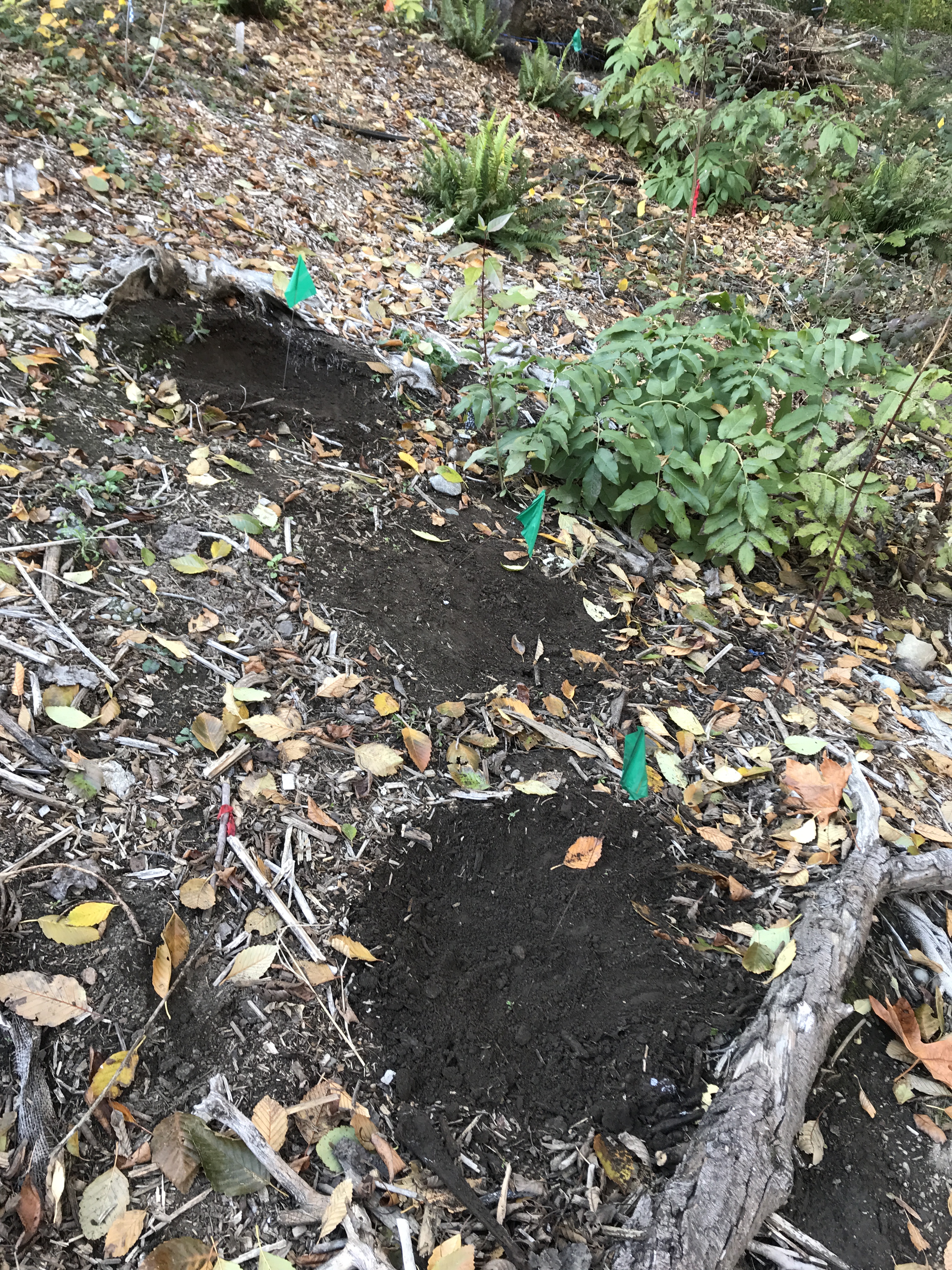 The primary task for the 5th service-learning session was to clear away the leaves, wood chips and weeds from all of the spots where new native trees, shrubs and ground covers would be planted on November 13th. Prior to the work party, Shirley and I had placed a green or pink flag at each of those locations.