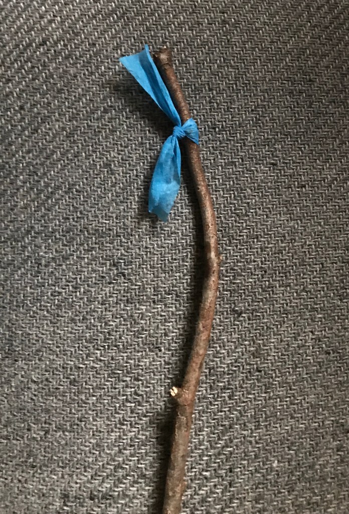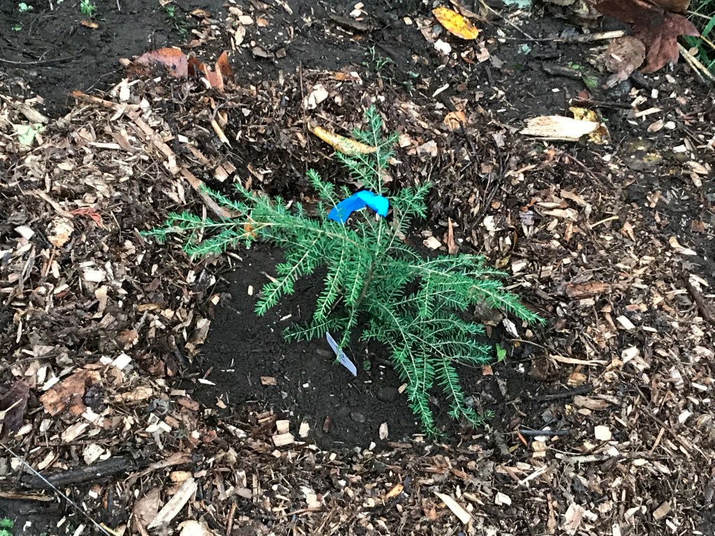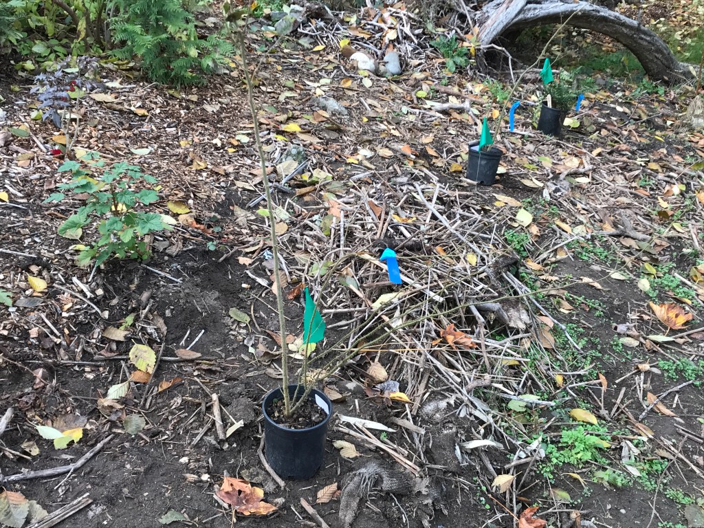 Every year, each new plant is marked with a soft flagging tape. The tape may be attached to the plant itself or may be on a nearby stake. The tape is different for each planting season. Blue and white checkered tape was used for the Nov 2017 to March 2018 planting season and red with black polka dots for 2018-19. This season the tape is a light blue. You can see it on many of the plants in the photos above.
